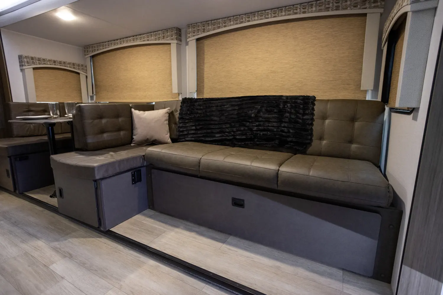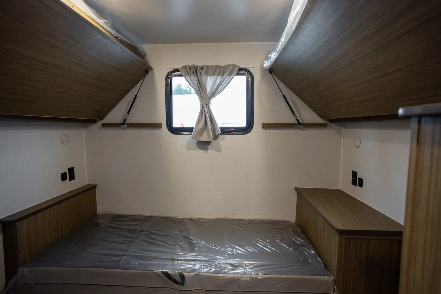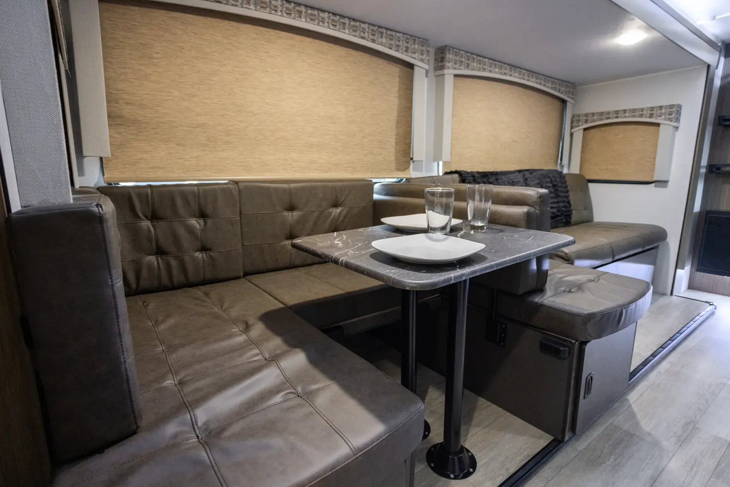 The Evo Northwest 2985VBX floorplan has one entry and one slide out. Exterior features include: fiberglass exterior, 16' awning and outside kitchen. Interiors features include: bunk beds, u-dinette and front bedroom.