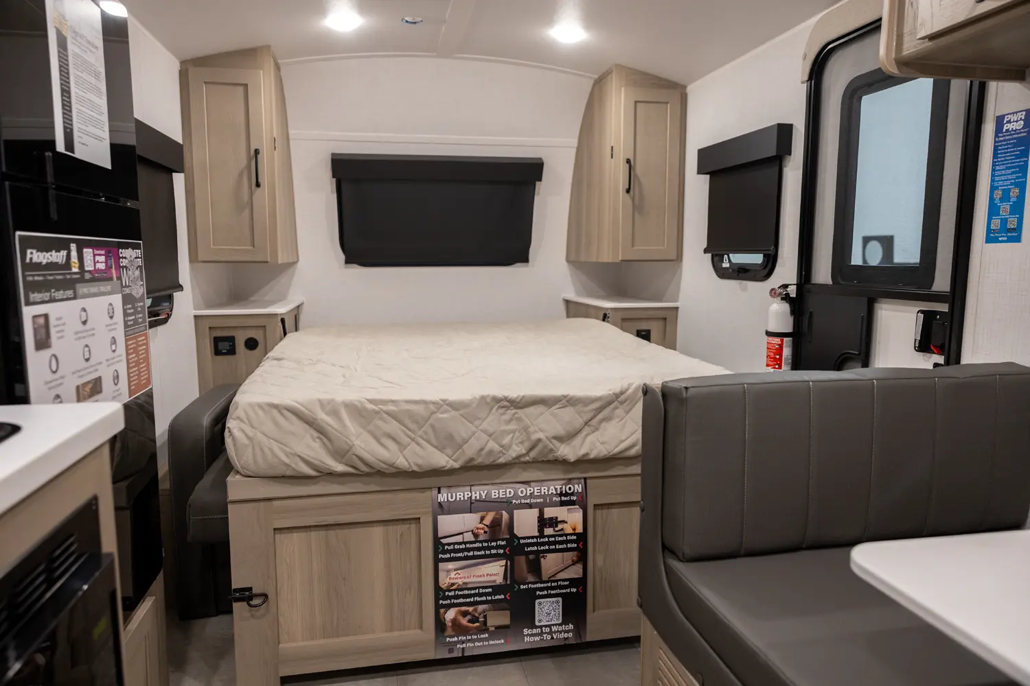 The Flagstaff E-Pro E19FDS has one entry and one slide out. Exterior features include: fiberglass exterior and 14' awning. Interiors features include: murphy bed and rear bathroom.