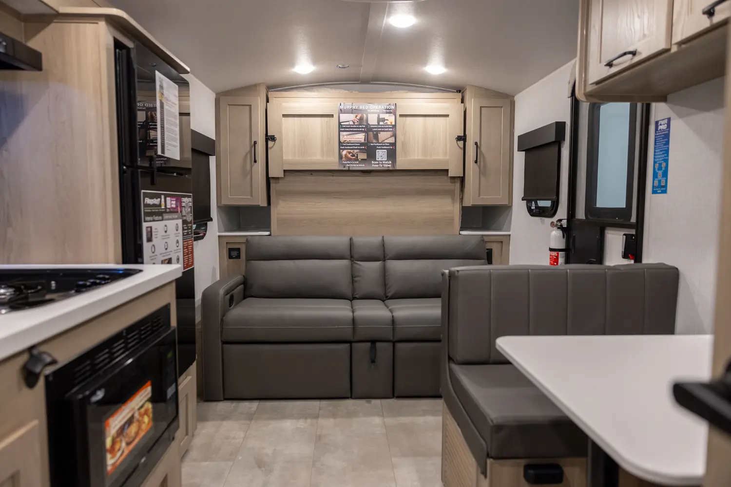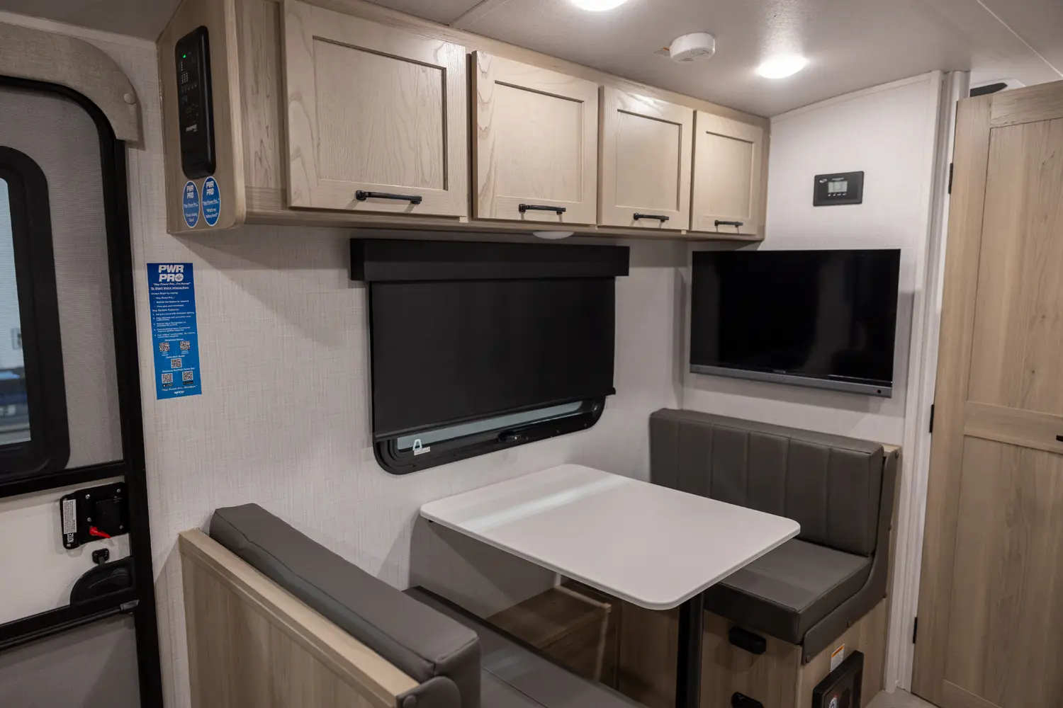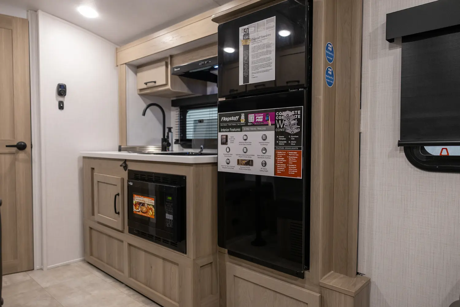 In this Flagstaff E-Pro E19FDS, you will find that the full-length bathroom and large shower in this model is the overwhelming highlight. The Murphy bed and kitchen slide in this 20’ travel trailer makes the living room in this unit so spacious. The door side dinette with a large window, gives this unit a “right at home” feel. This single axle trailer checks so many essential boxes.