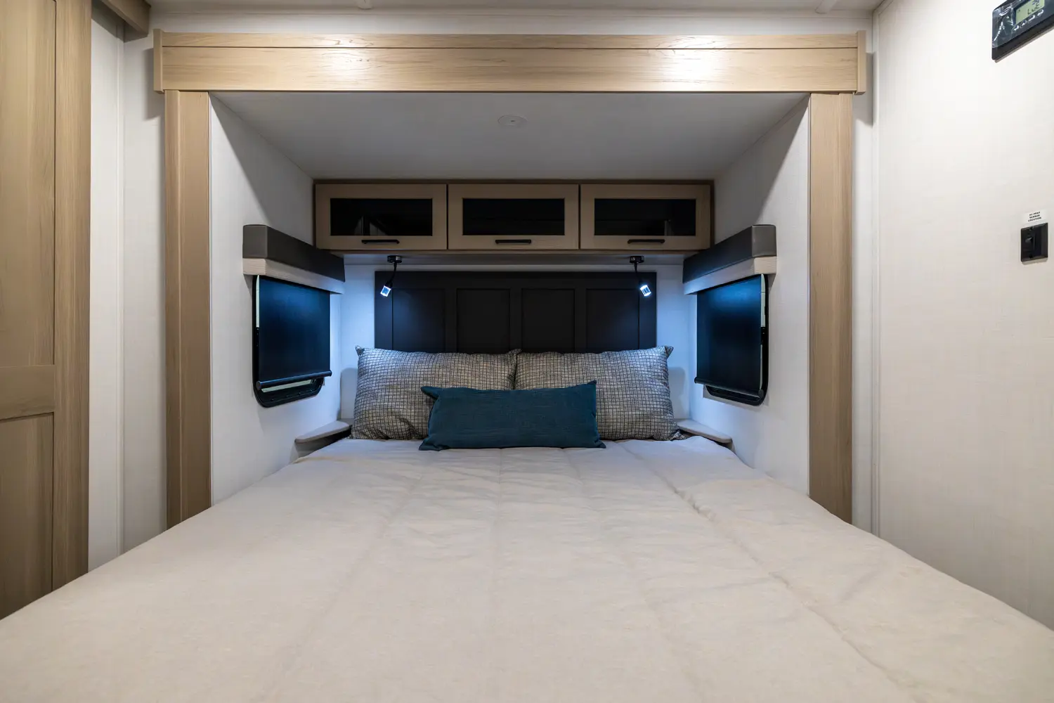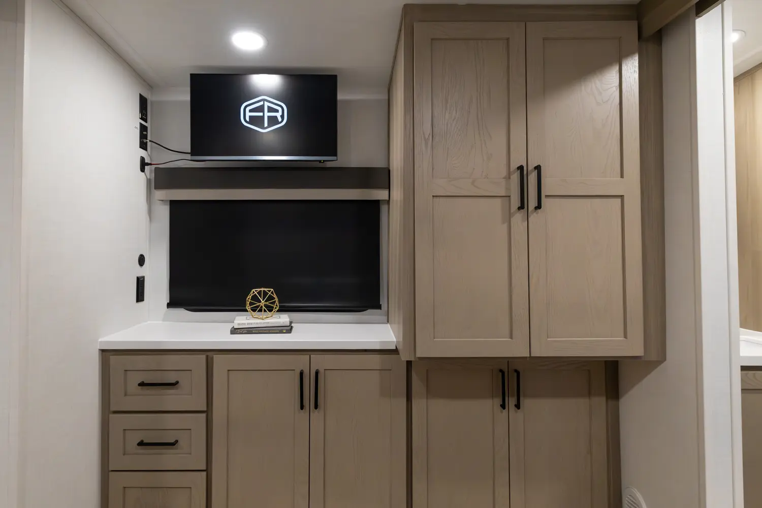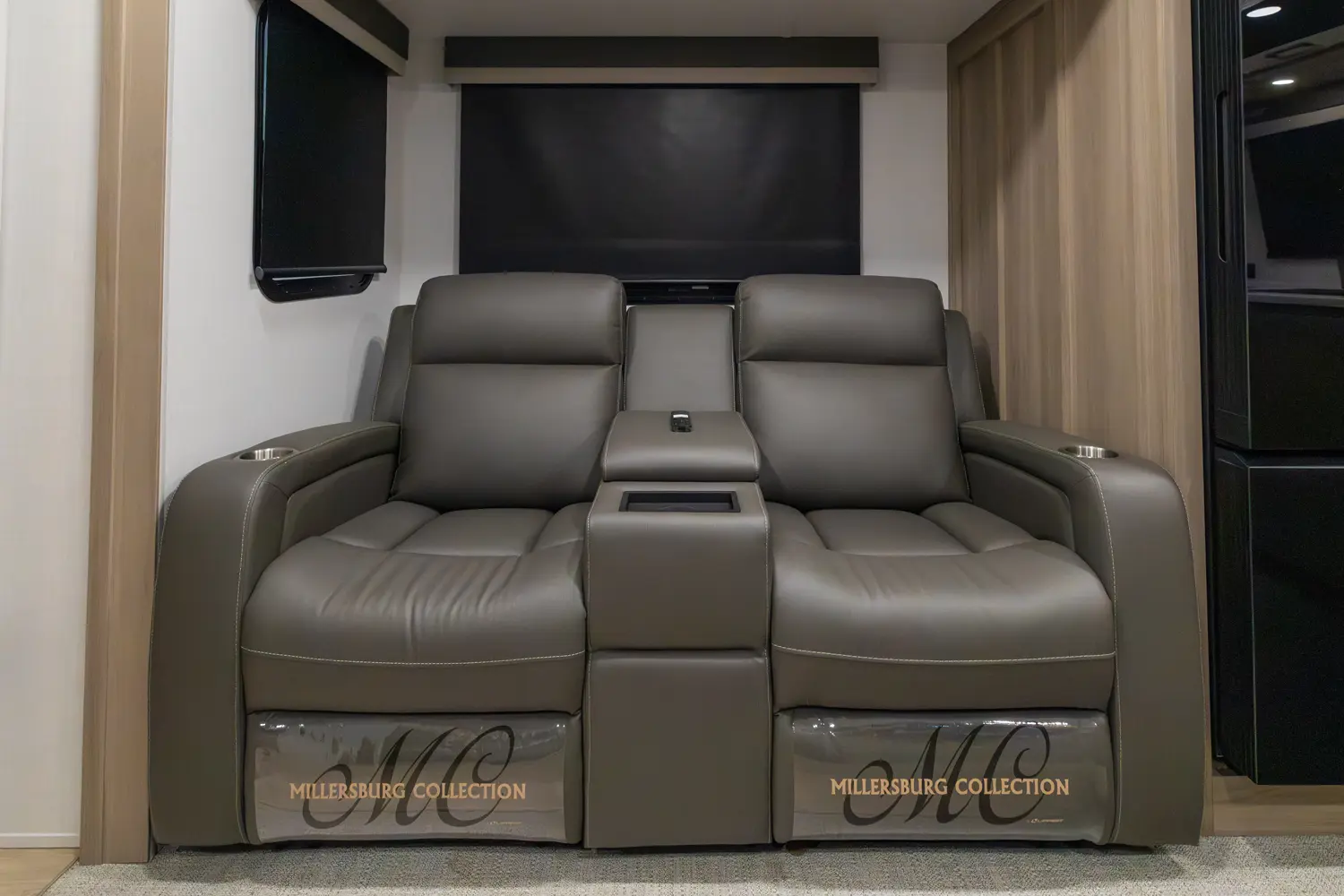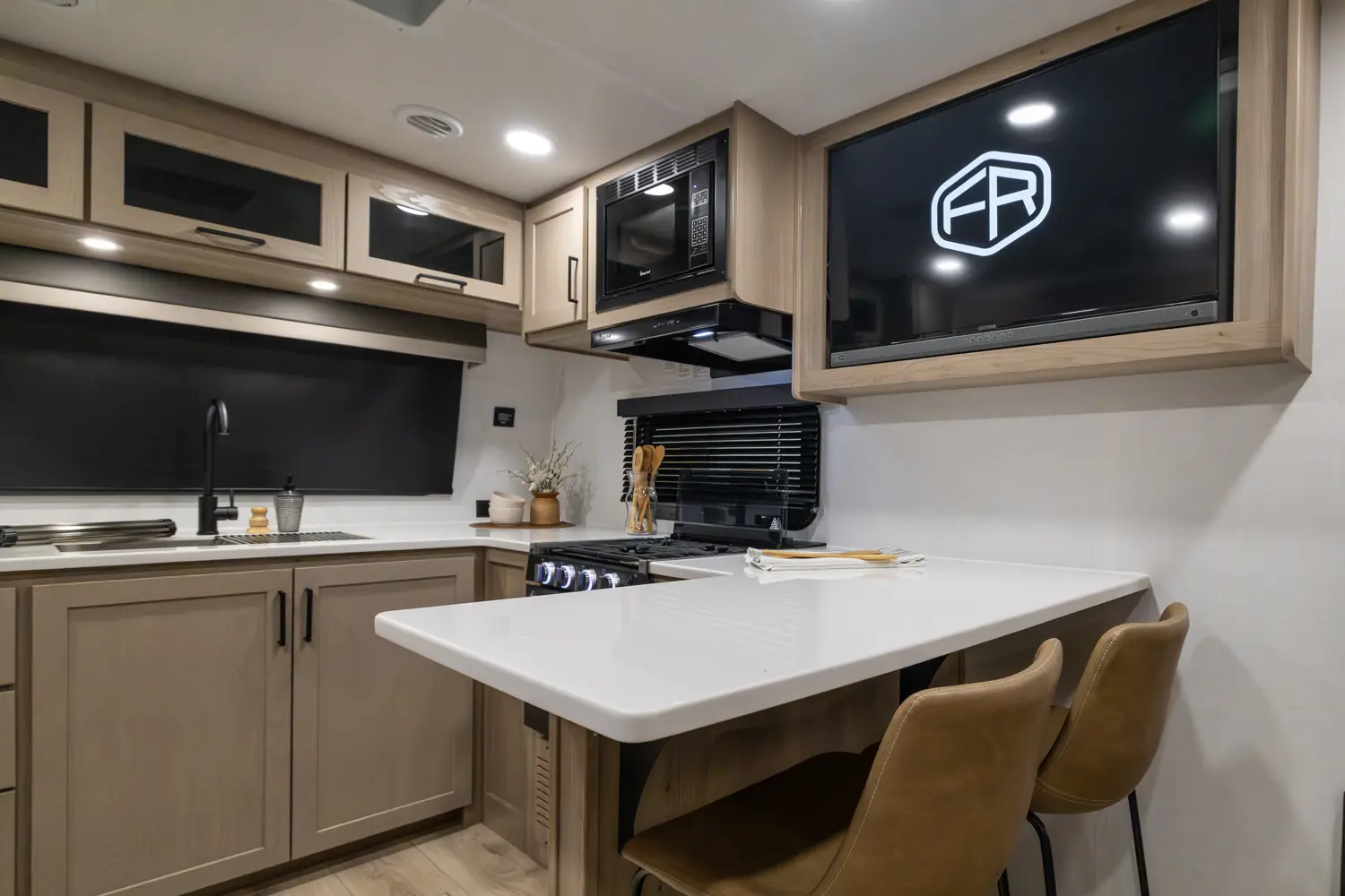 The front kitchen with a large window creates an open, inviting feel with great campsite views. Theater seating faces the entertainment center for easy viewing, with an optional hide-a-bed for guests. The bedroom includes a queen bed in a slide-out, dresser, and wardrobe with washer/dryer prep. A spacious bathroom with a large shower and linen storage adds comfort and convenience, making this coach feel like home.