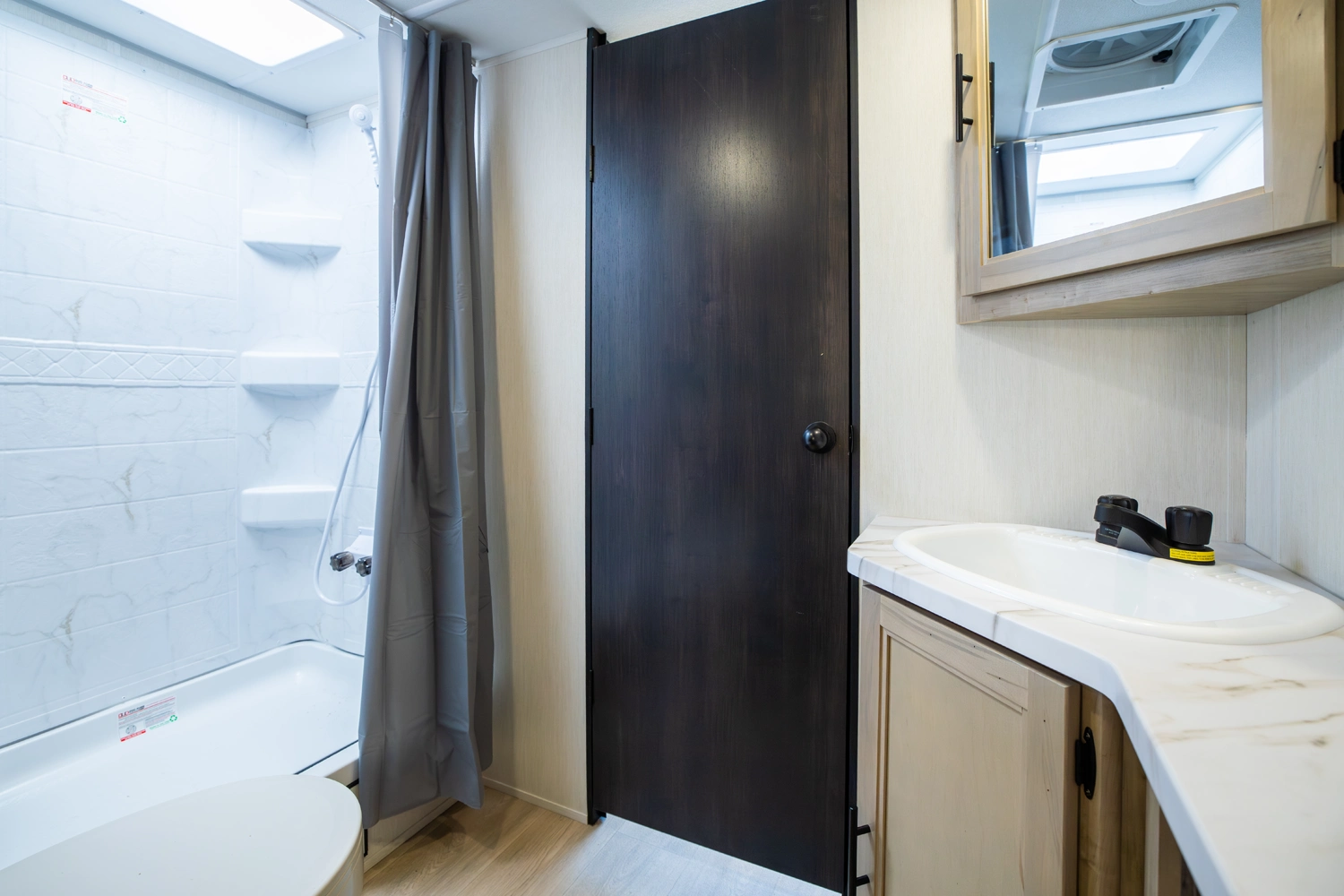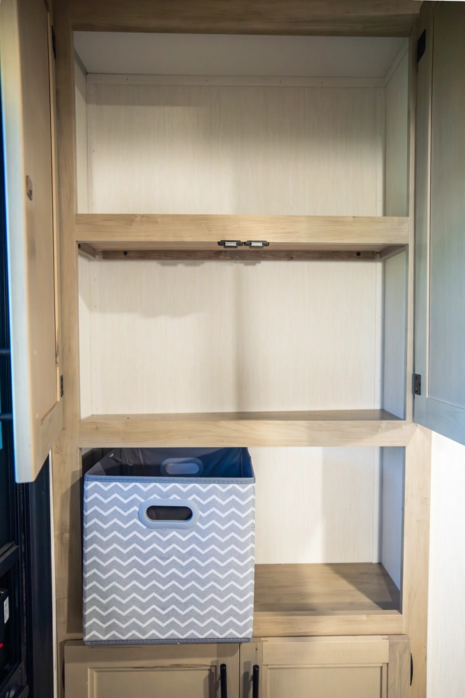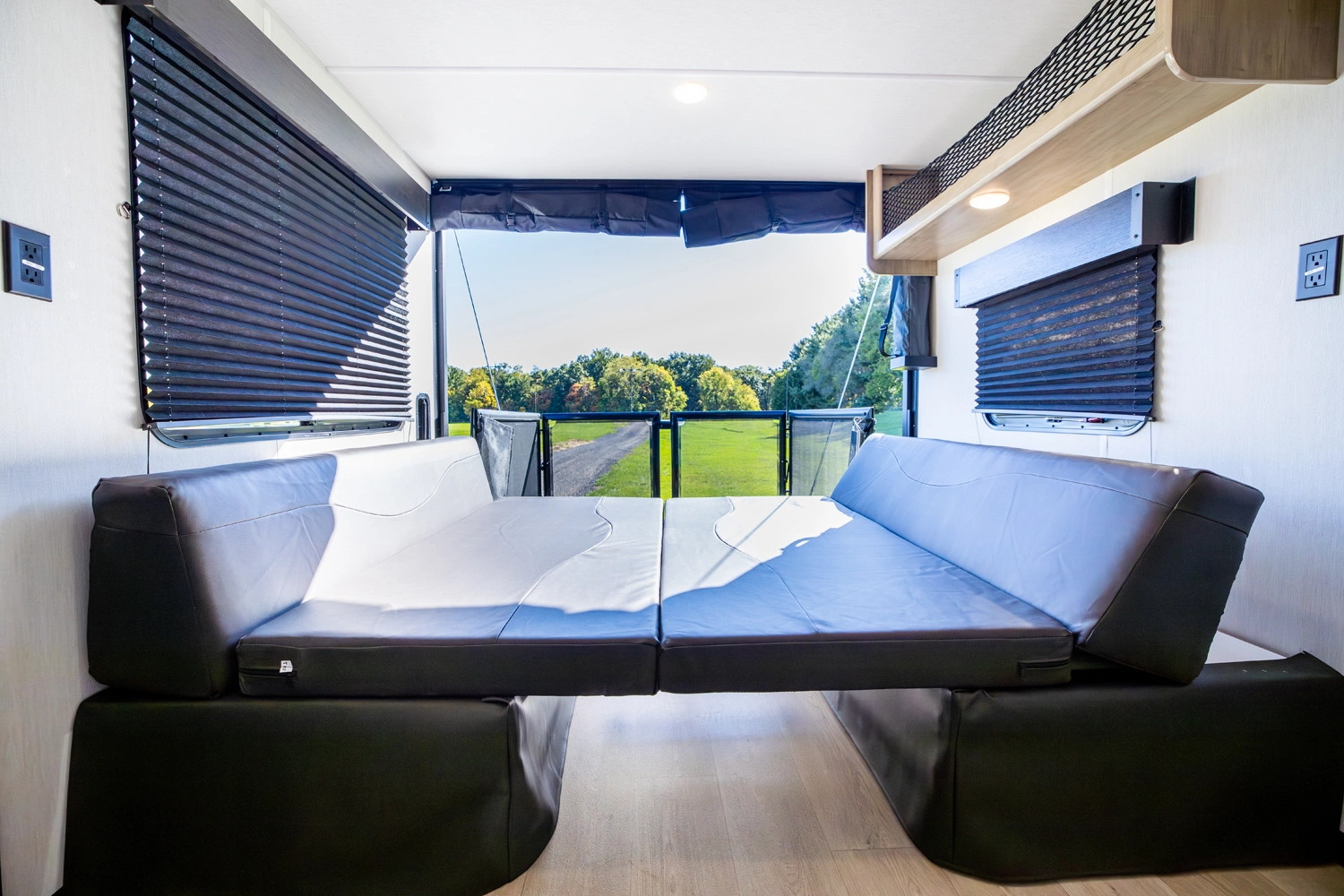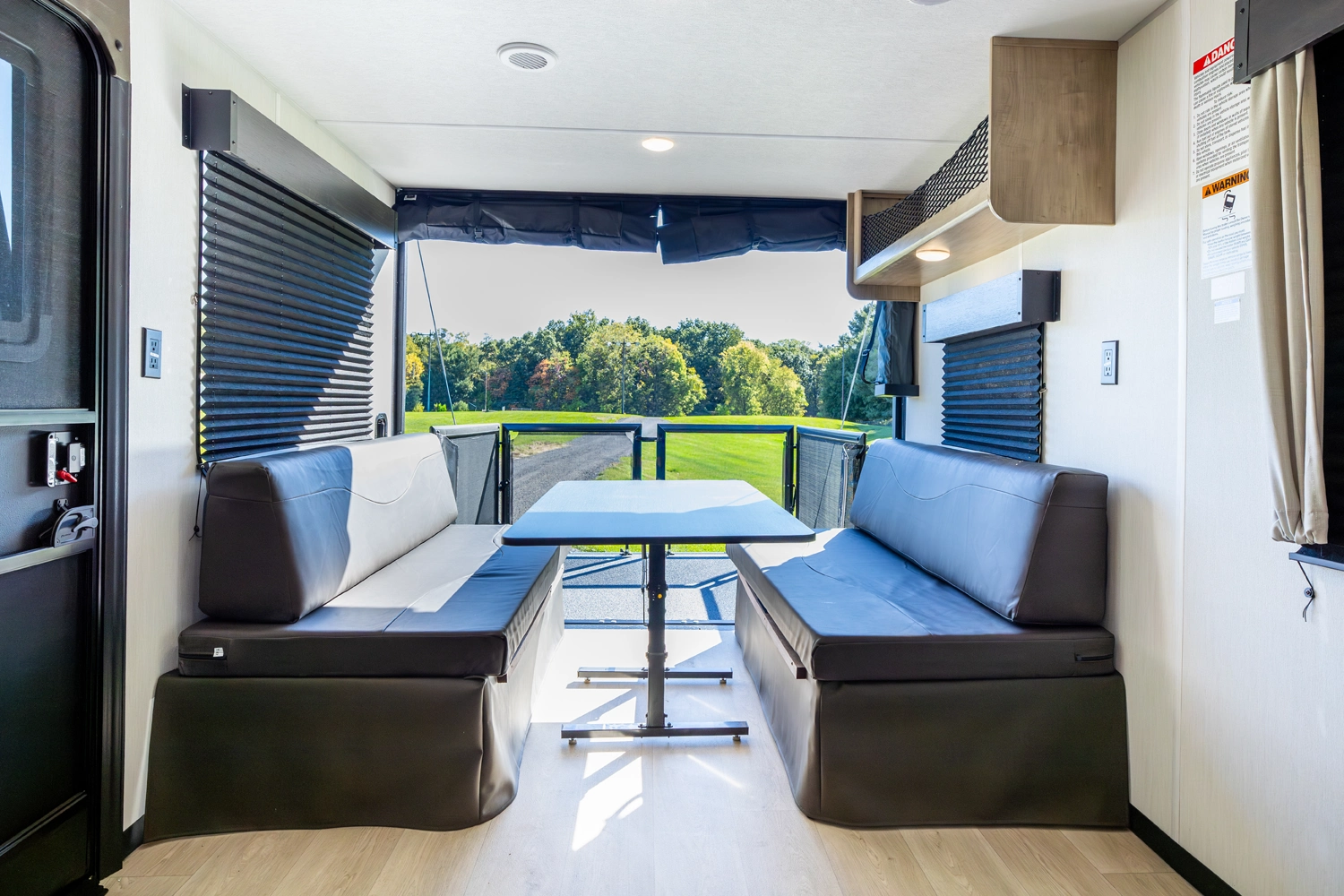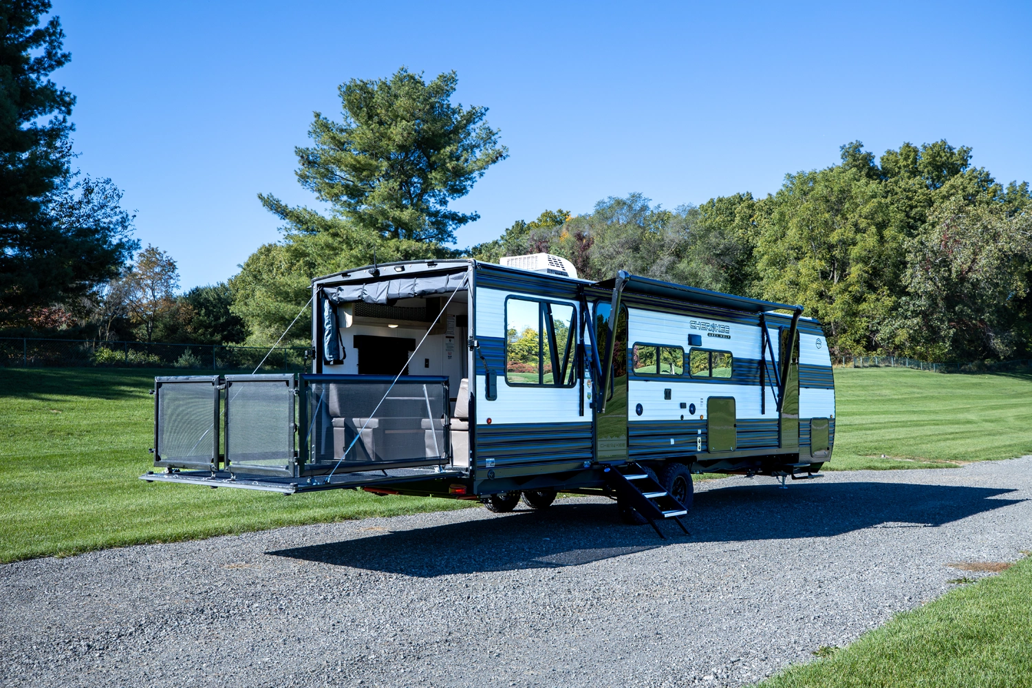 The Grey Wolf 24RRT by Forest River is a versatile and affordable travel trailer that offers a spacious open-concept design. The rear ramp provides easy access to the toy hauler garage area, which can be converted into a patio deck for outdoor living. The comfortable living area features ample seating and a collapsable table. The well-equipped kitchen, with its full-size pantry, 12-volt refrigerator, air fryer combo microwave, and plenty of prep space, is perfect for cooking and entertaining.