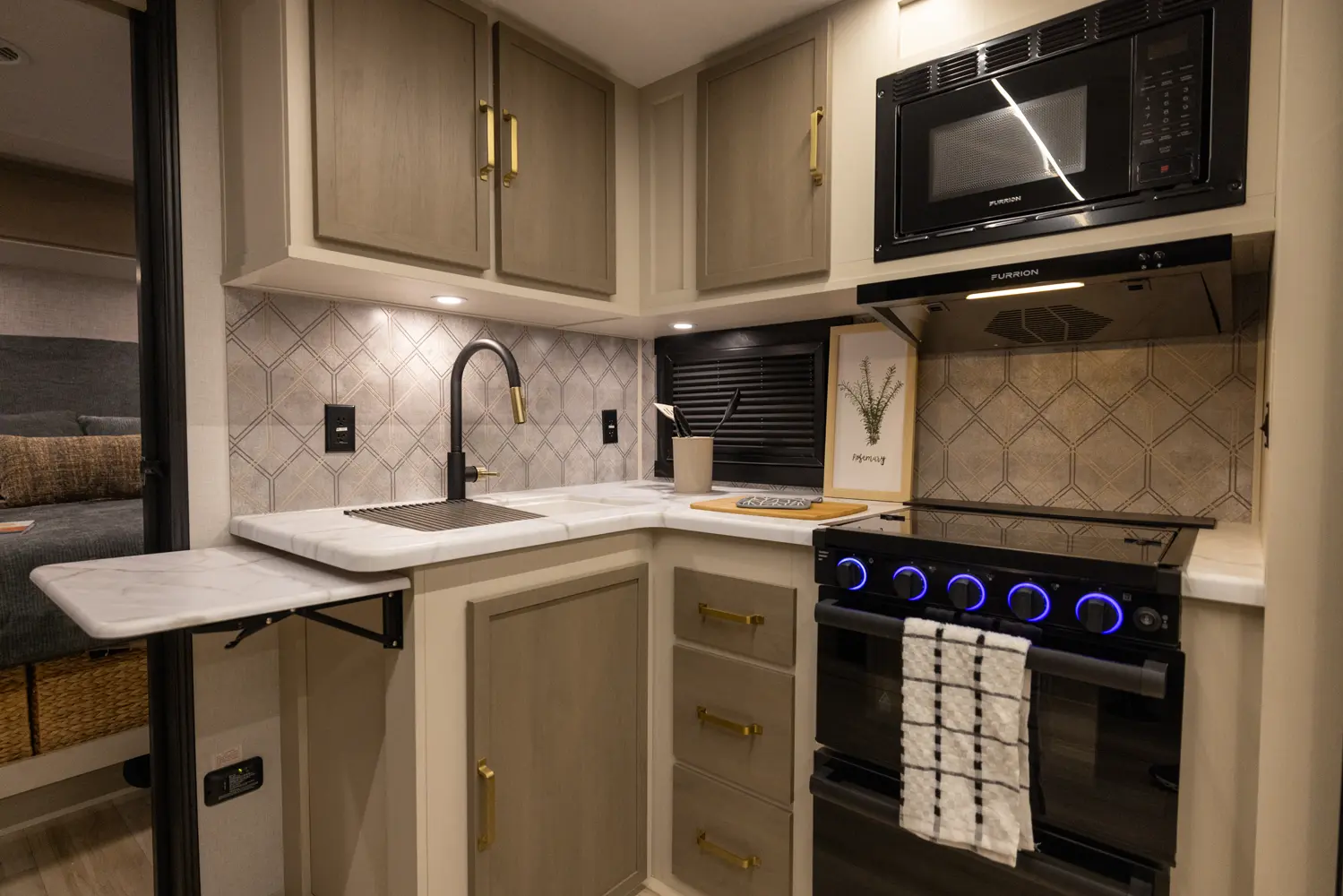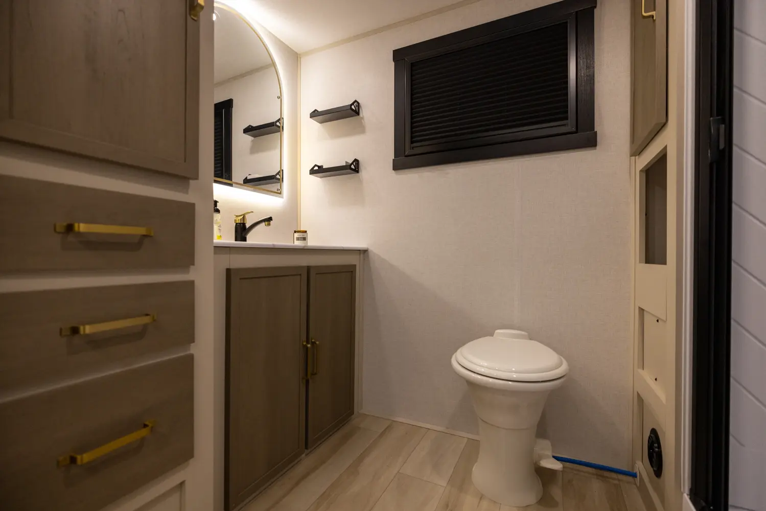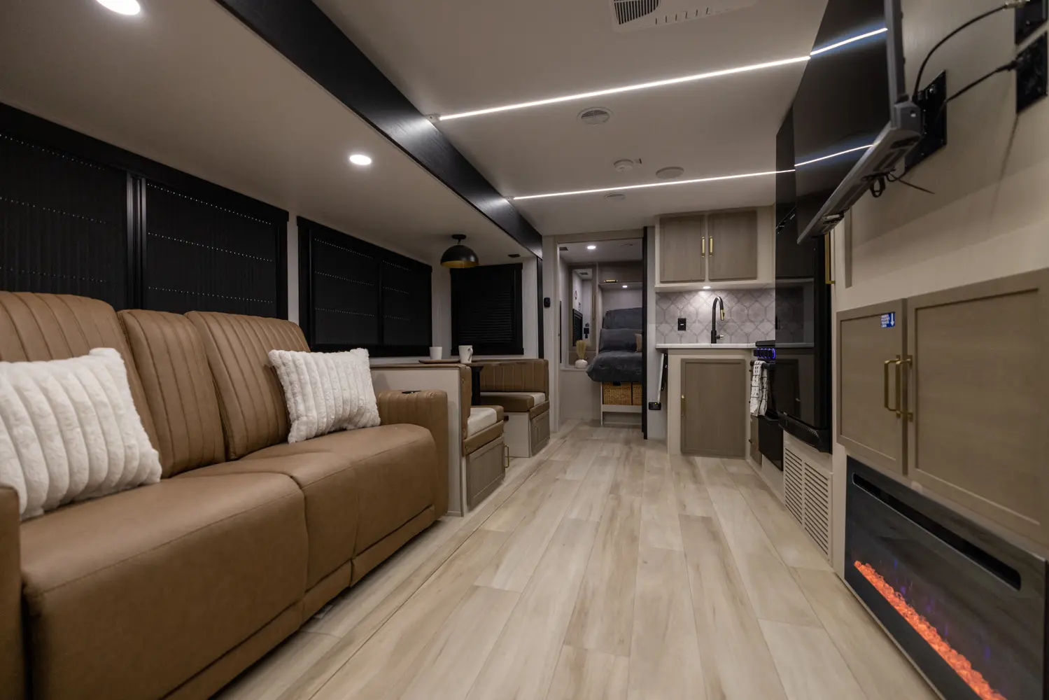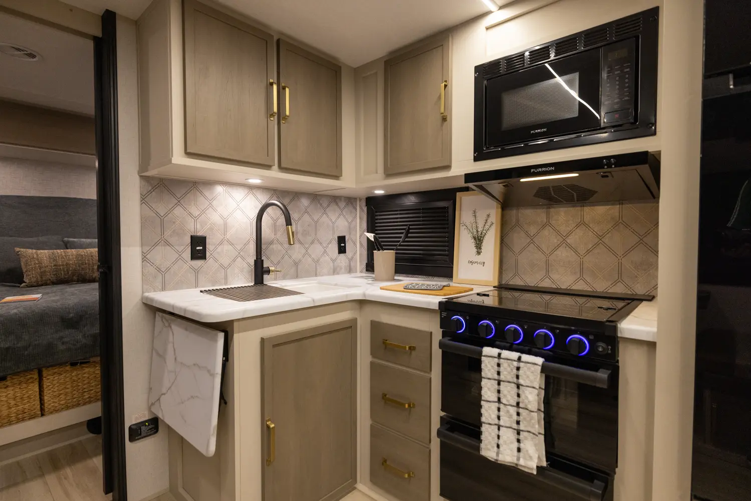 No corners were cut in the 25RBHL. The theater seat (facing the entertainment center) and full-sized dinette separate the best-in-class bathroom and bedroom. 36" wide sliding barn doors offer complete privacy, or the ability to open the 25RBHL up from front to back. This camper also offers a refrigerator outside underneath the awning.