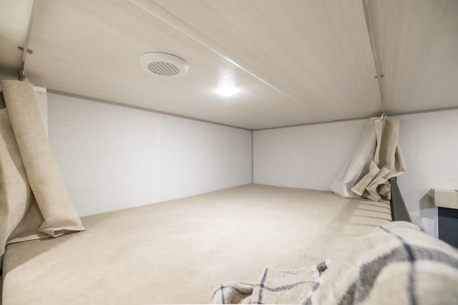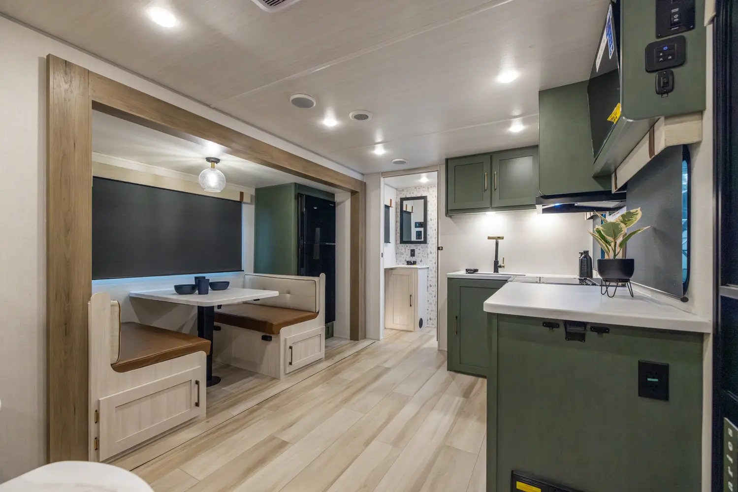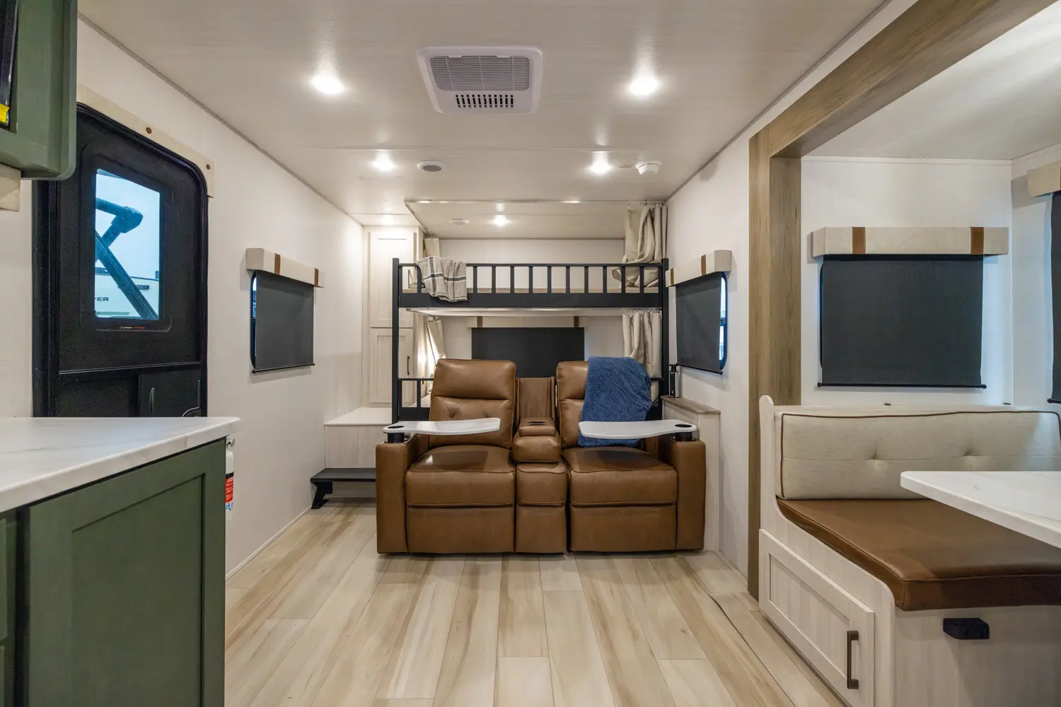 Spacious and family-friendly, this travel trailer features a front queen bedroom with dual wardrobes, central kitchen with large fridge and air fryer microwave, booth dinette slide-out, rear double bunks, and walk-through bath. Built for extended-season use with heated enclosed underbelly, radiant foil insulation, 12V tank pads, 21' power awning, outdoor griddle, and pass-through storage, ready for any adventure.