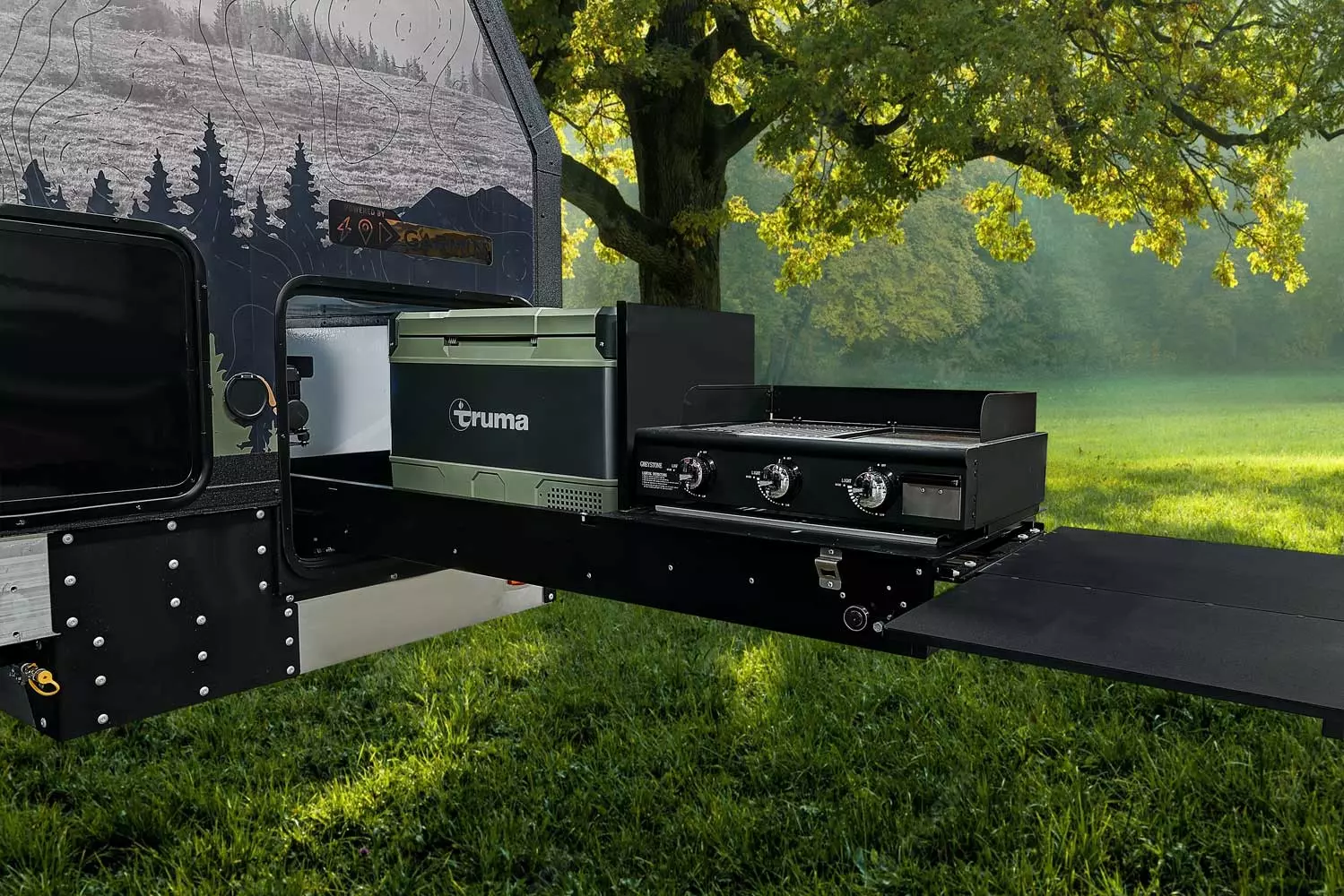 • Extended Slide Outside Kitchen w/12 Volt Truma Cooler, Grill/Griddle Combo, Collapsible Sink, Pull-Out Prep Table, and Outdoor Pantry (20.3 & 21.4 only)