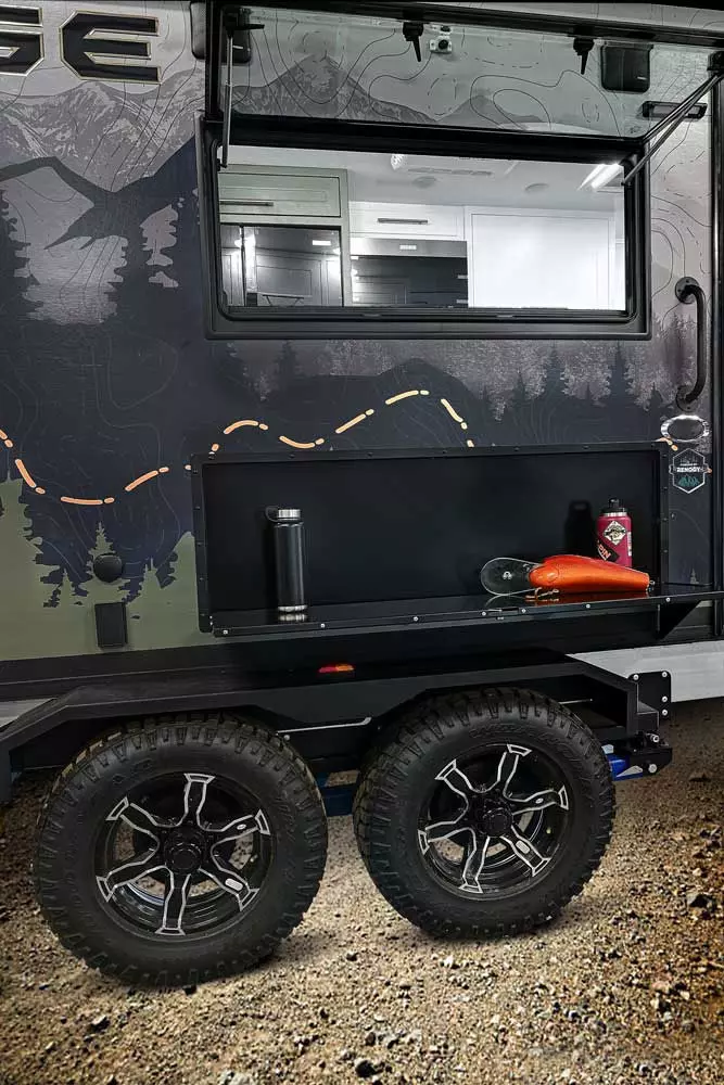 • Outside Pullout Kitchen with 12V drawer Referigerator, Gas Griddle, Collapsible Sink, ,Cutting Board, Detachable sprayer hose with hot and cold water (16.4 only)