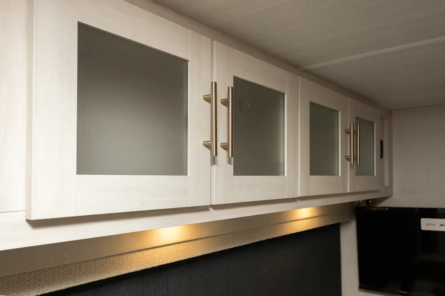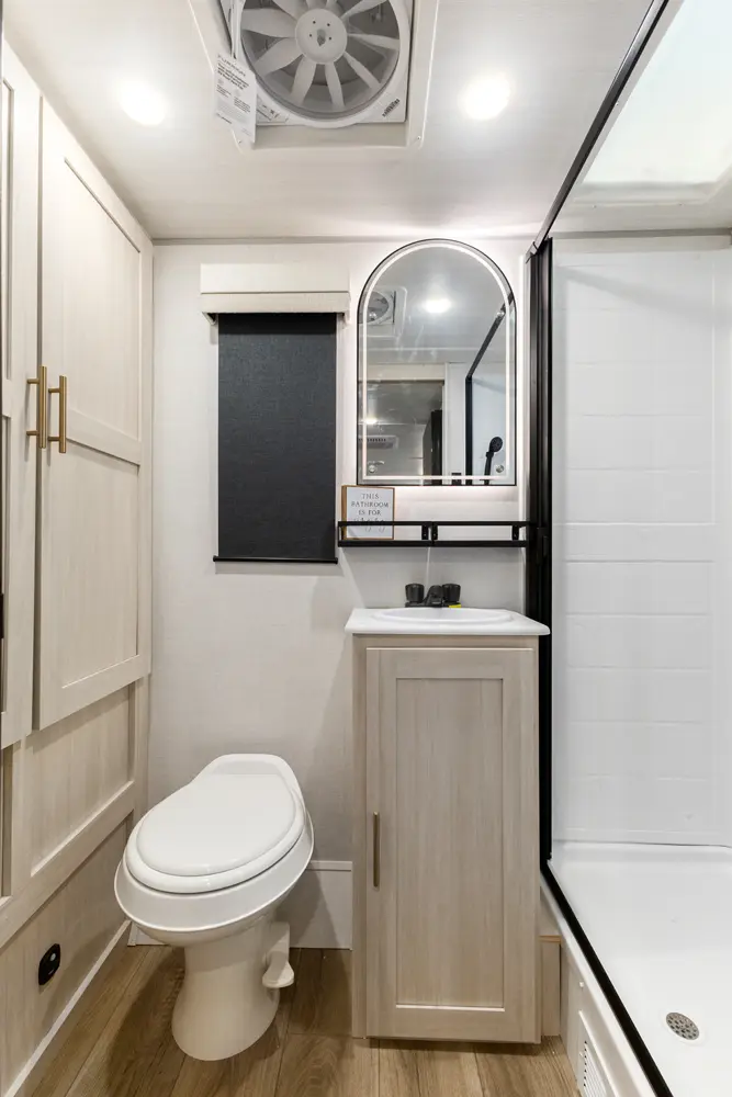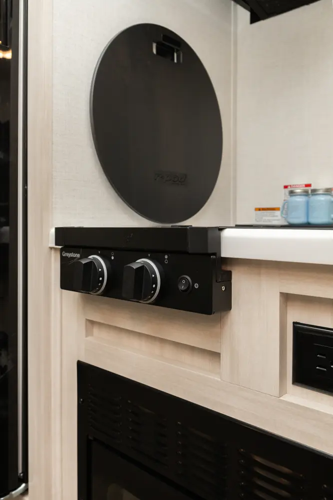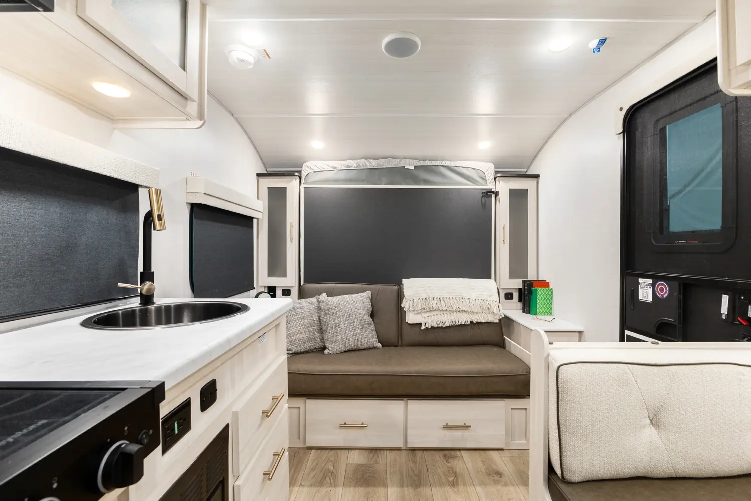 The RP-192 offers a spacious layout in a compact design. It features a versatile front Murphy bed that converts to a sofa, maximizing living space. The rear bath includes a full shower and ample wardrobe storage. A booth dinette provides dining and additional sleeping options. Modern amenities like a convection microwave, 12V refrigerator, and central vacuum system ensure comfort on the road. Ideal for couples or small families seeking a lightweight, feature-rich travel trailer.