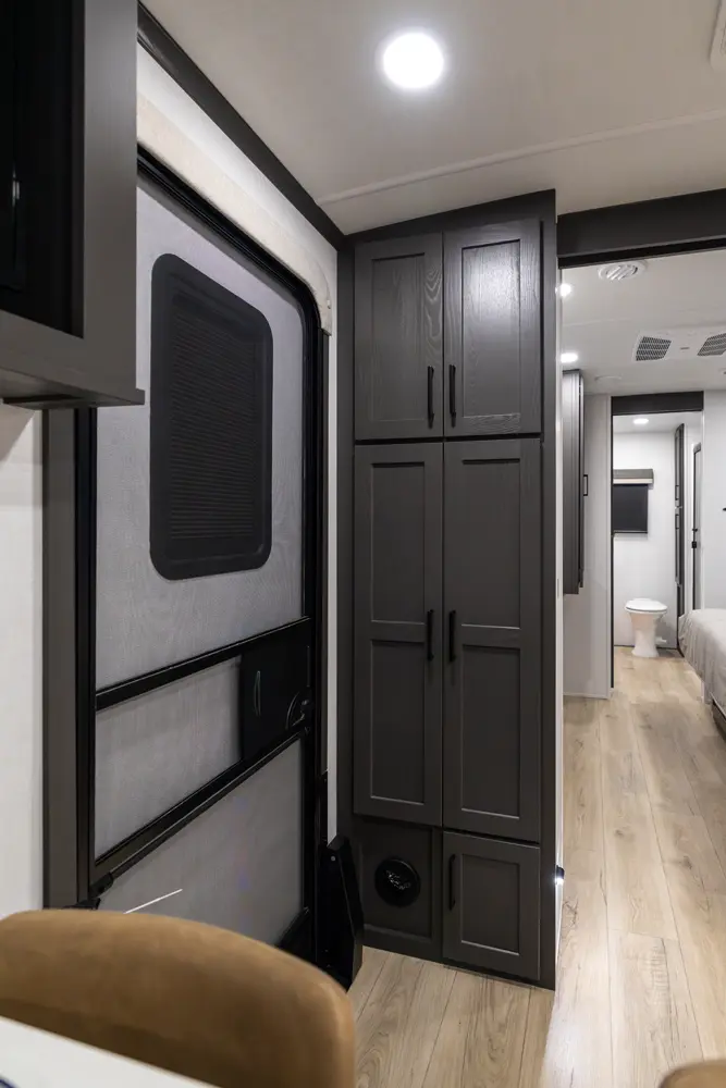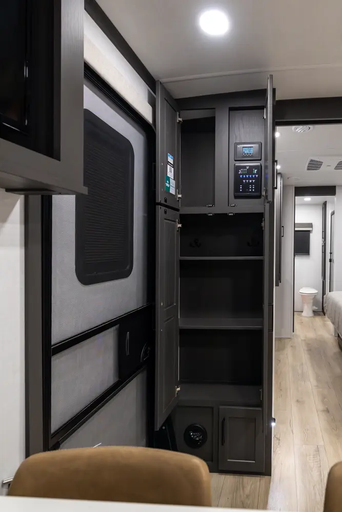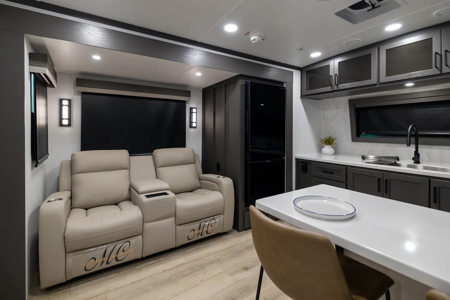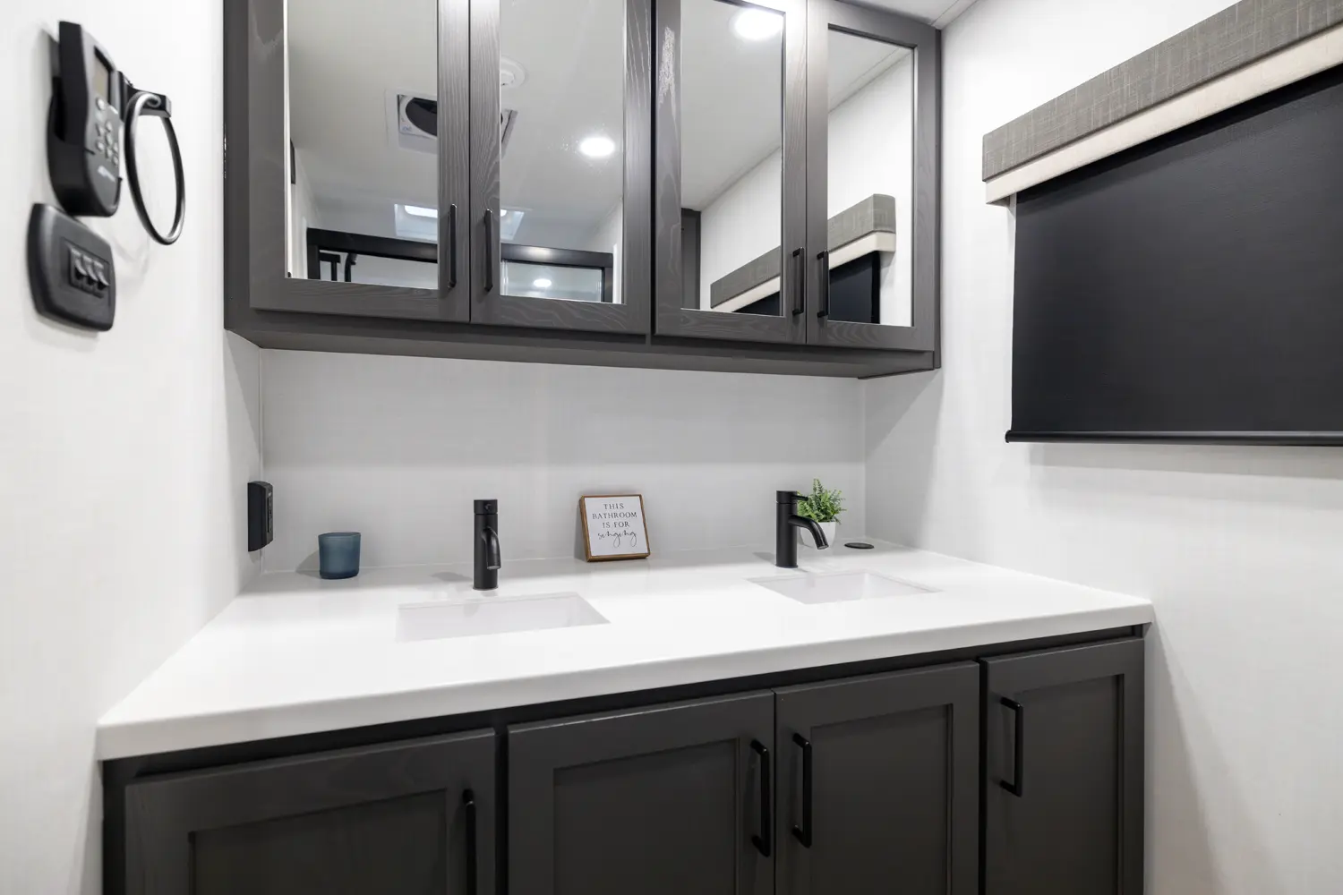 The two person bar top seating and a large window in the front give this coach an open feel with the ability to see your campsite. The theater seating is directly across the entertainment center for easy viewing and comfort. The bedroom in this unit is the game changer with a king bed in a slide out, a large wardrobe and dresser in the middle of this bedroom is perfect. A bathroom with a double sink vanity and 48” x 30” shower with a seat make this bathroom truly a master.