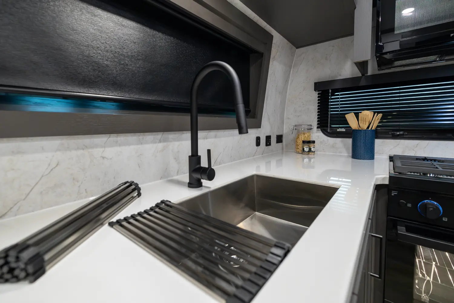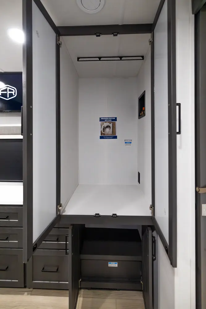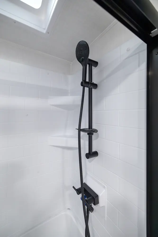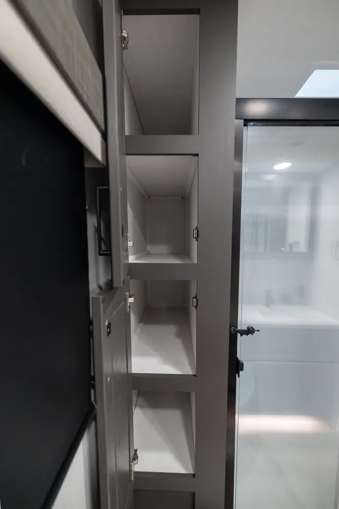 The two person bar top seating and a large window in the front give this coach an open feel with the ability to see your campsite. The theater seating is directly across the entertainment center for easy viewing and comfort. The bedroom in this unit is the game changer with a king bed in a slide out, a large wardrobe and dresser in the middle of this bedroom is perfect. A bathroom with a double sink vanity and 48” x 30” shower with a seat make this bathroom truly a master.