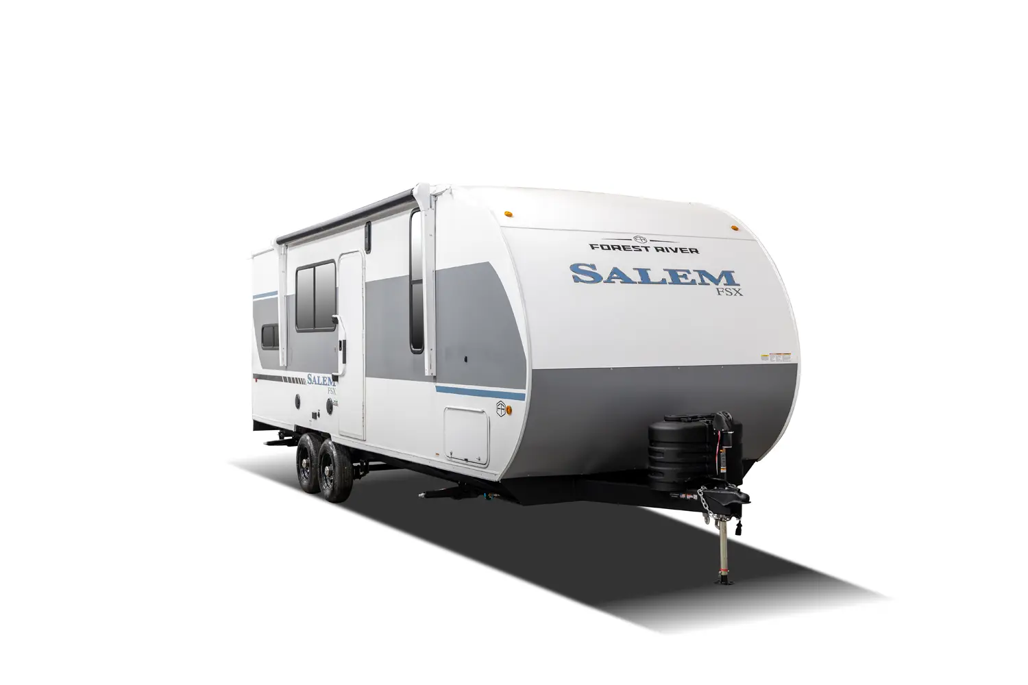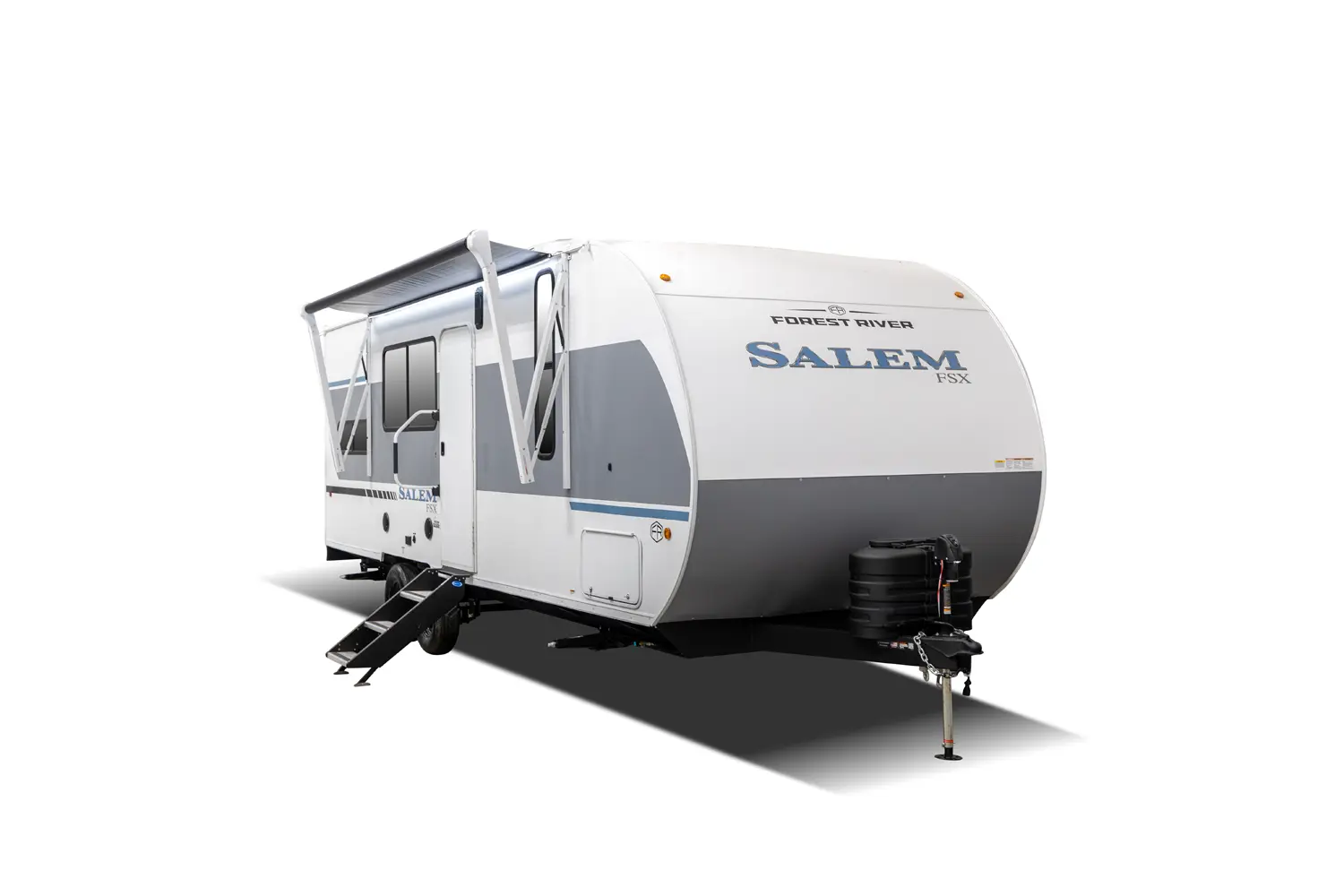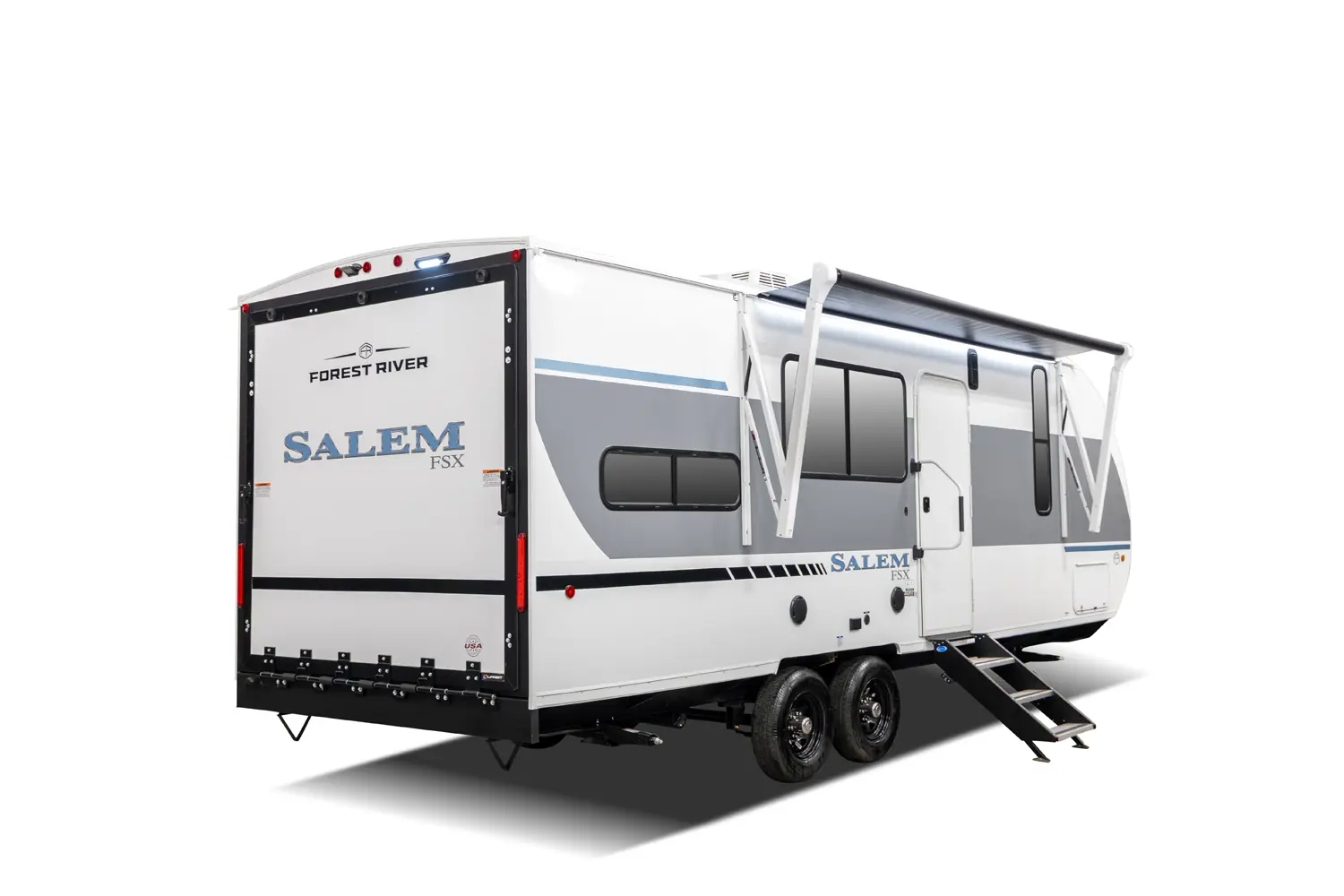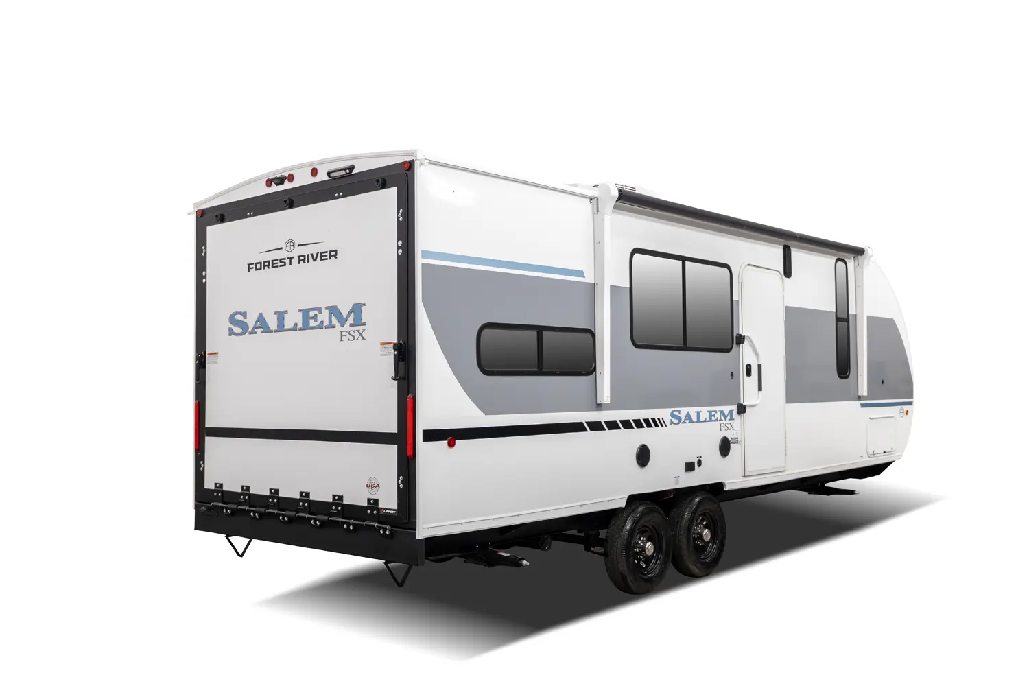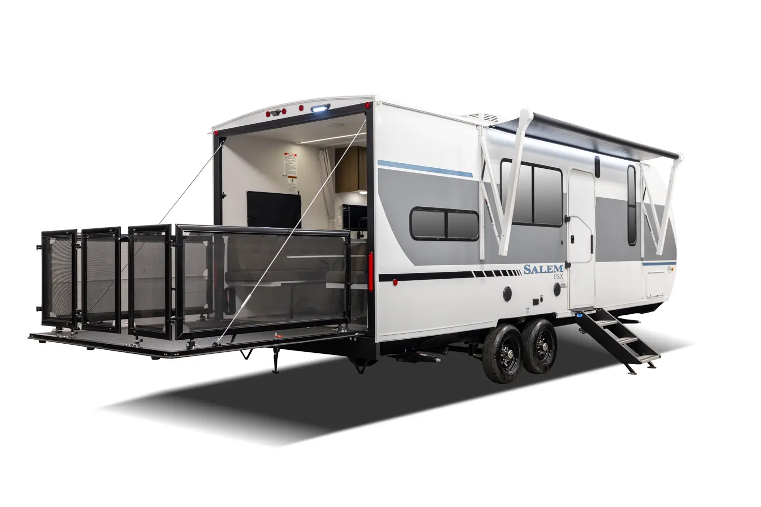 The 260RTK front bedroom provides a queen bed with extra storage, while the adjacent bathroom gives you a large skylight shower and mirrored linen closet. The kitchen provides modern appliances, panoramic window, and faux stone accent wall with entertainment center. Taking the crew on the road? The flip-down sofas and removable dining table in the garage convert to a king bed. Plus, the ramp door doubles as a party patio. At just over 5,000 lb., this toy hauler is ready to roll and easy to tow.