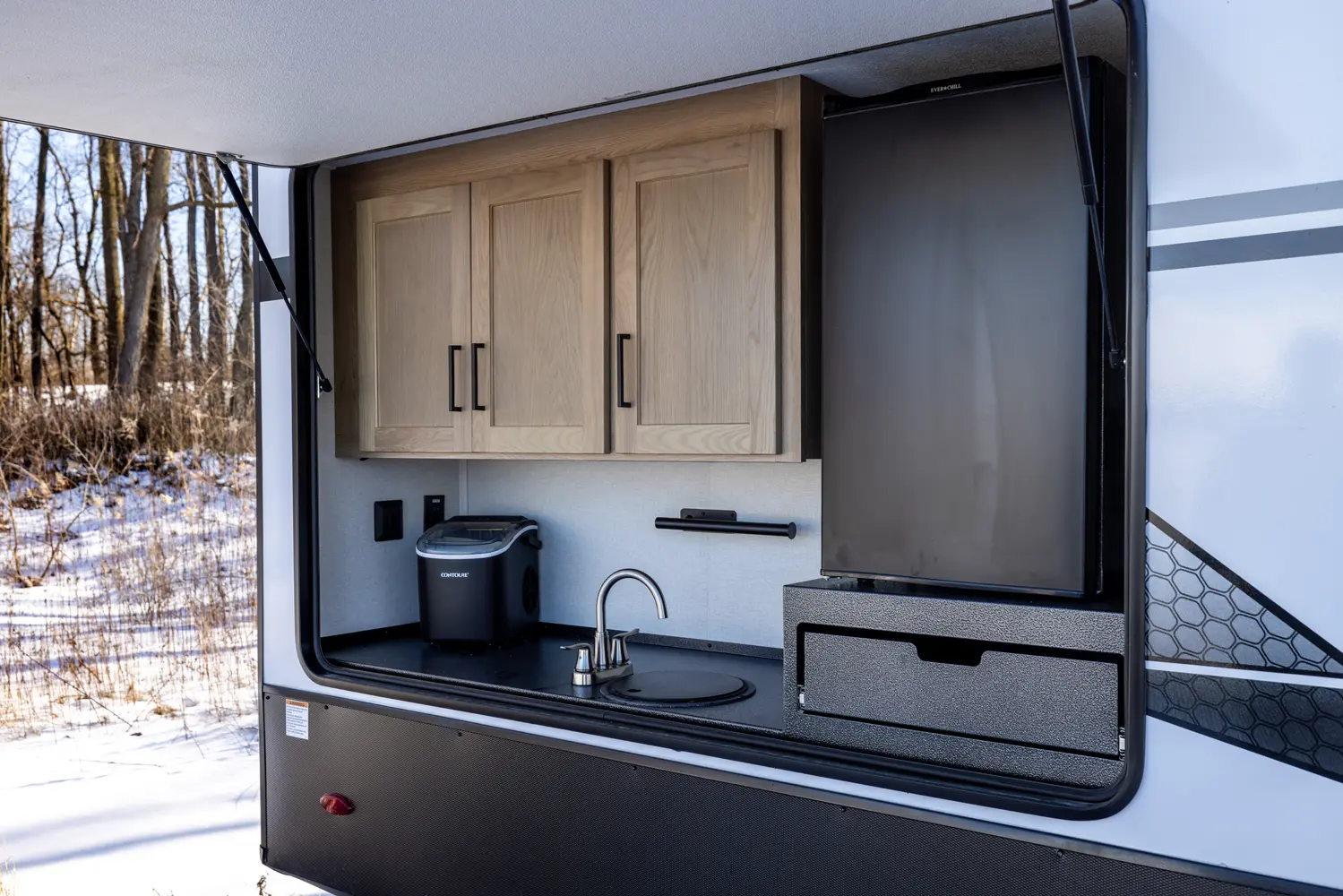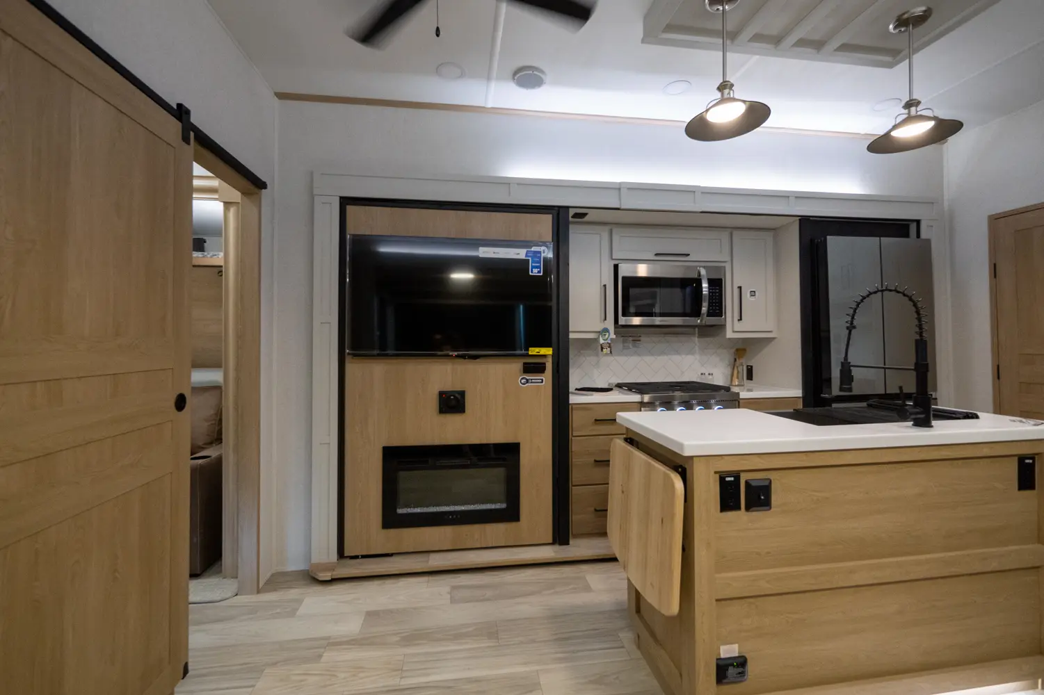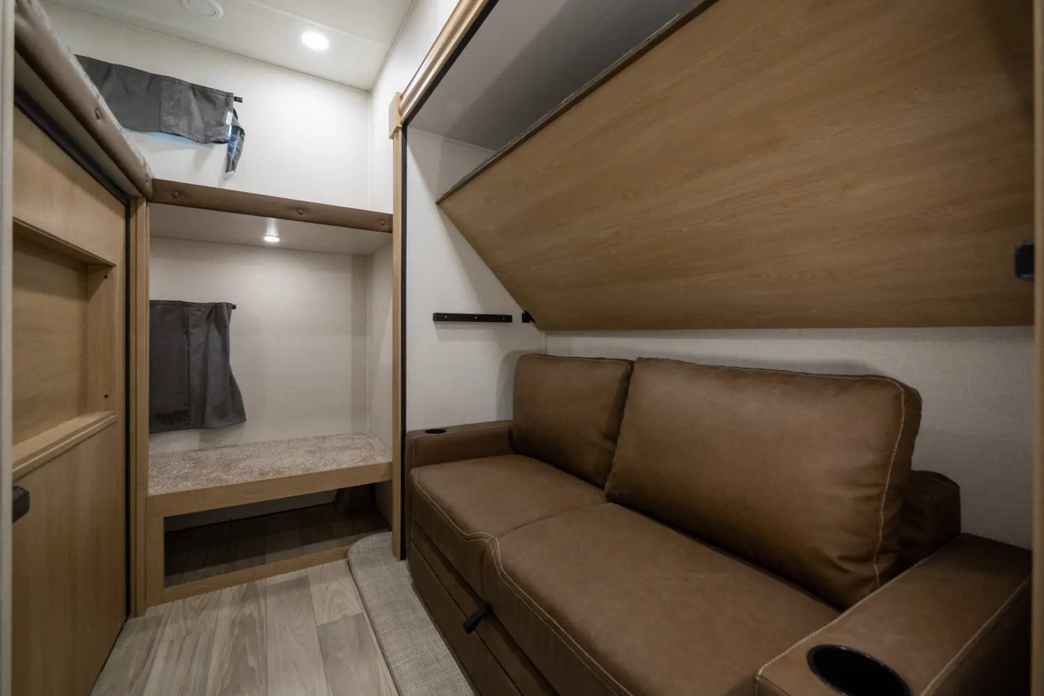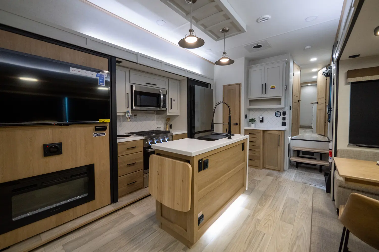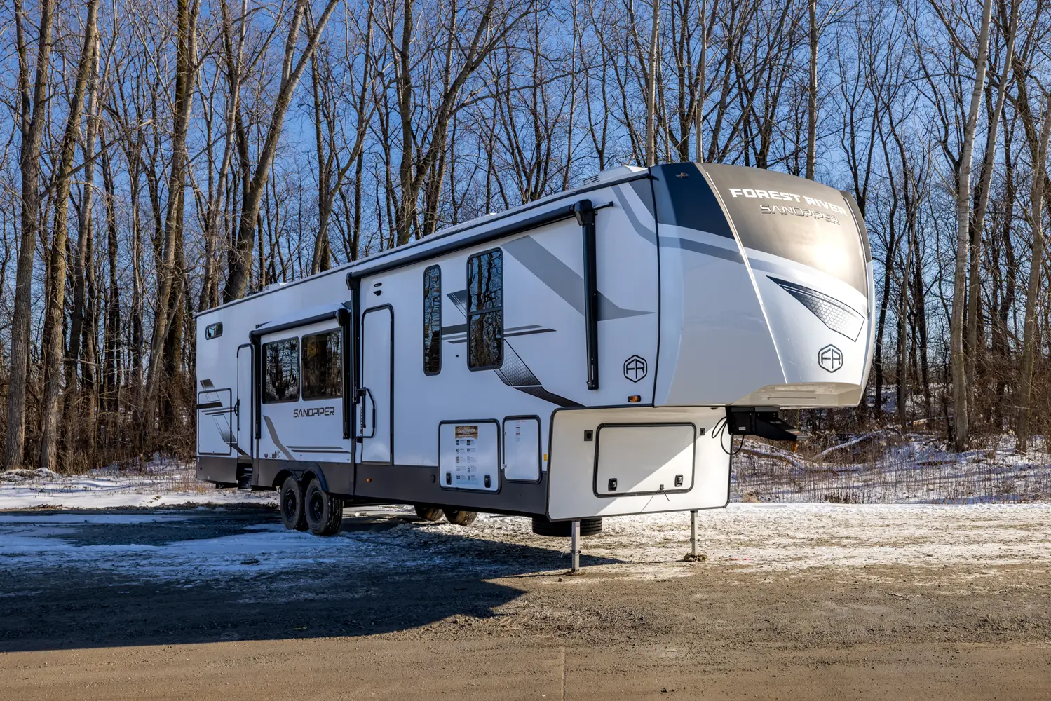 The Sandpiper Fifth Wheels 3880BH floorplan has two entries and four slide outs. Exterior features include: fiberglass exterior, 10'8" & 16' awning and outside kitchen. Interiors features include: bunk beds, kitchen island, free-standing dinette option, front bedroom and bathroom and a half.