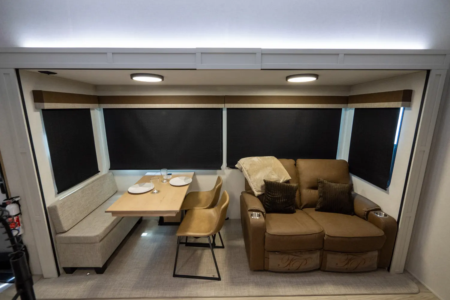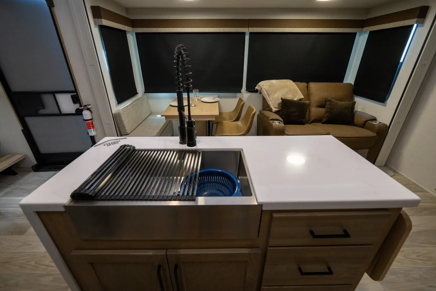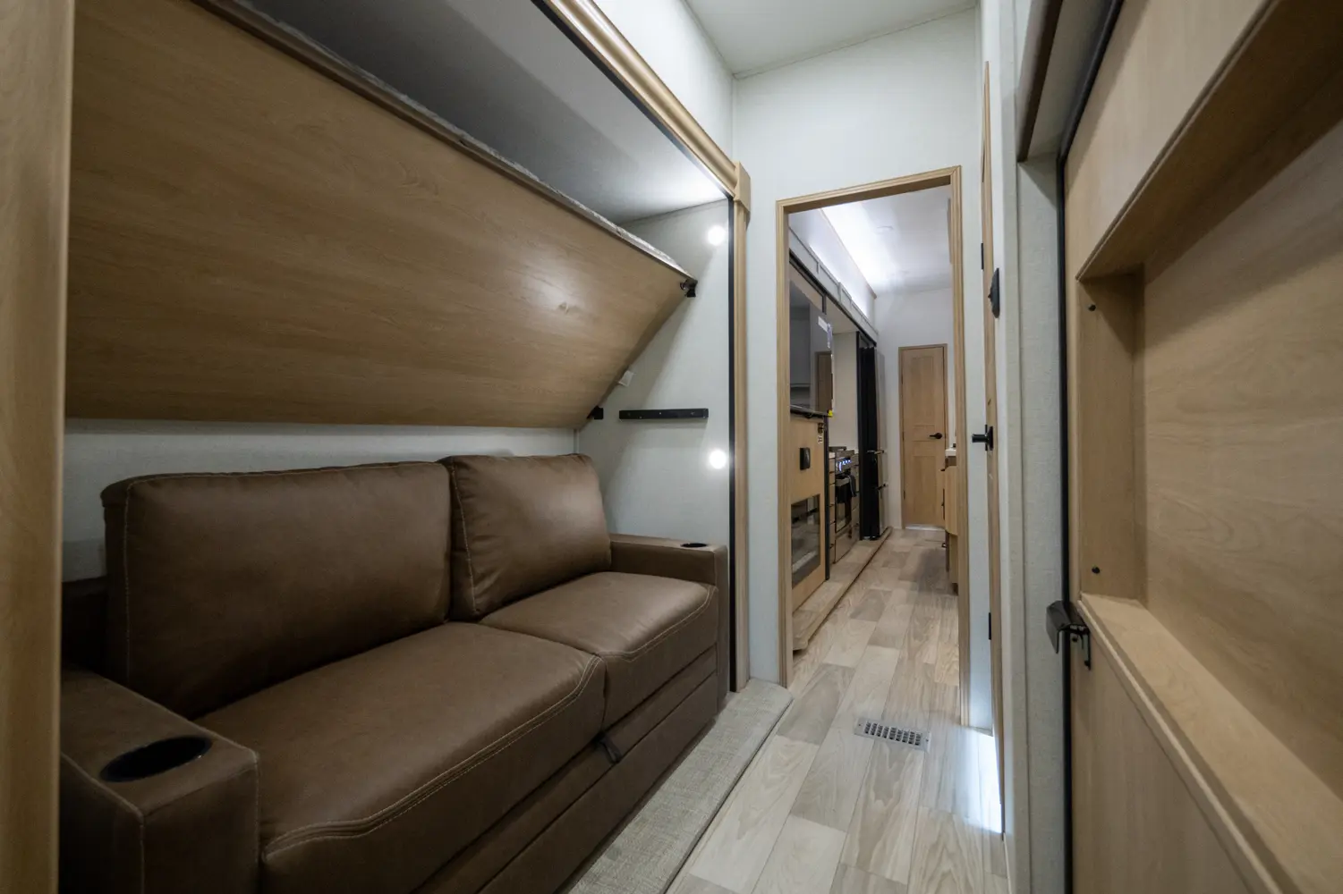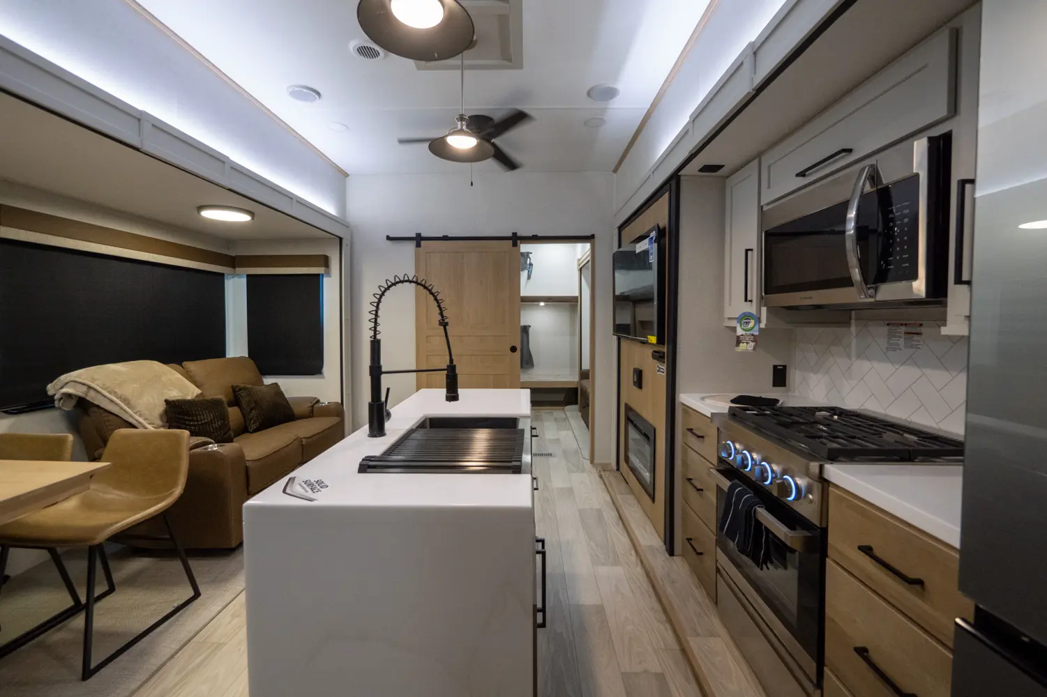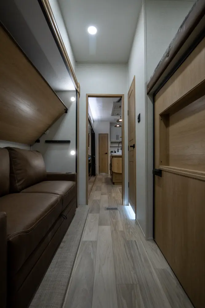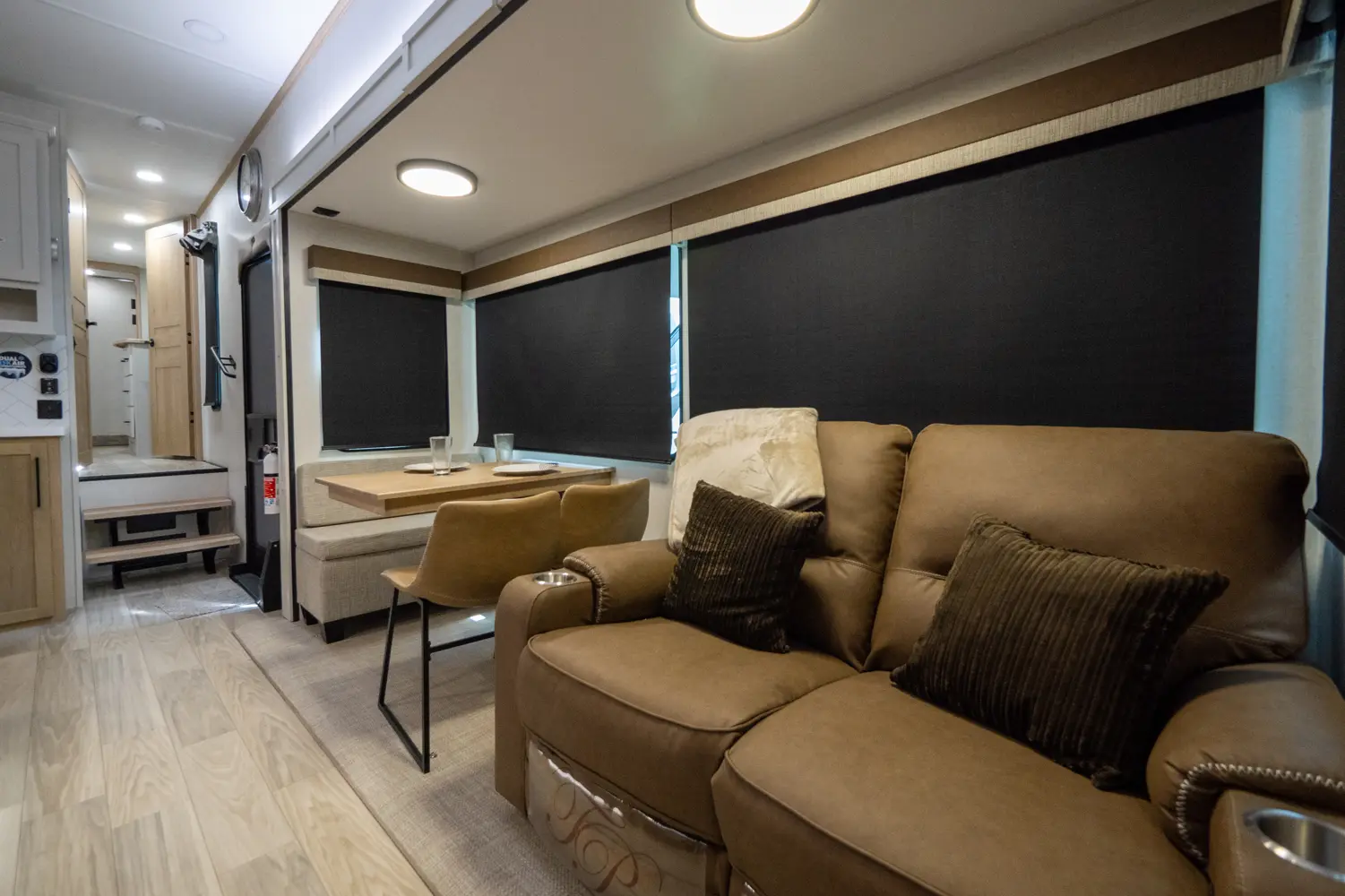 The Sandpiper Fifth Wheels 3880BH floorplan has two entries and four slide outs. Exterior features include: fiberglass exterior, 10'8" & 16' awning and outside kitchen. Interiors features include: bunk beds, kitchen island, free-standing dinette option, front bedroom and bathroom and a half.
