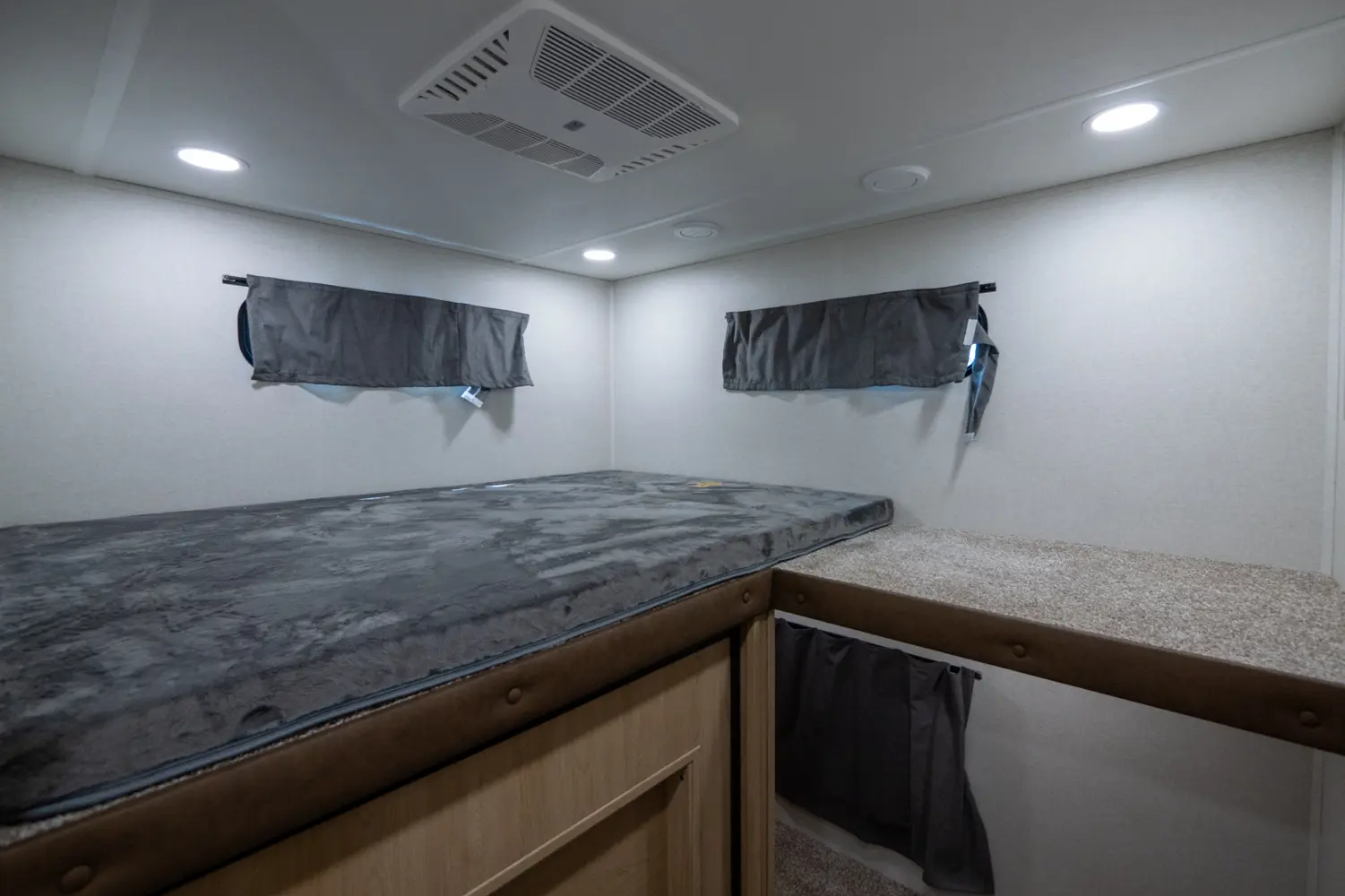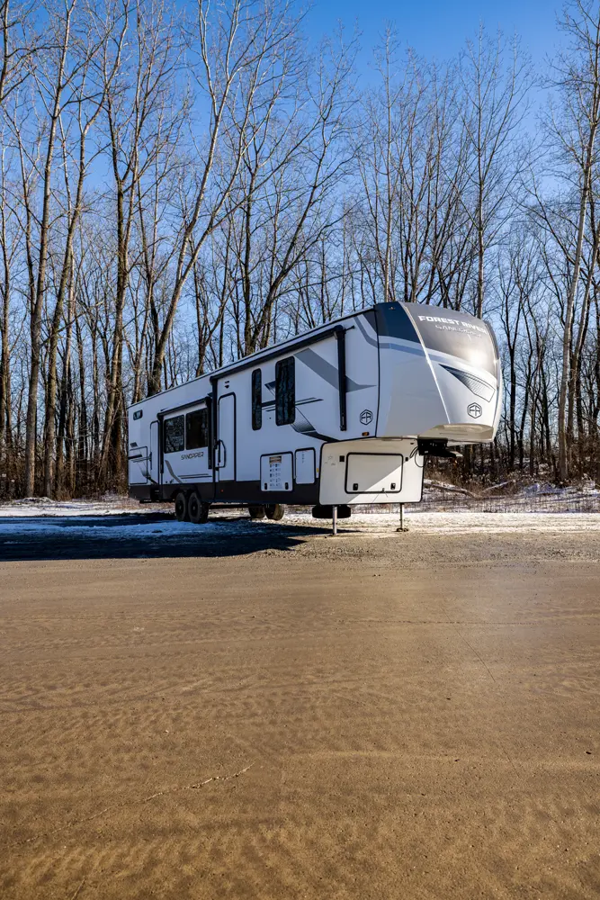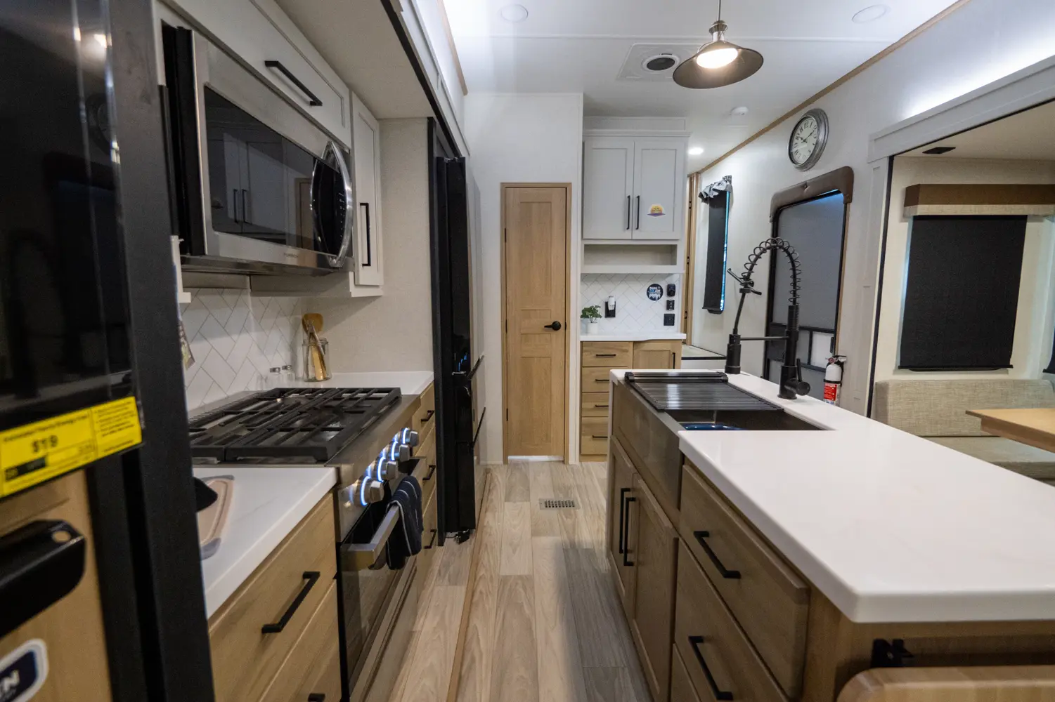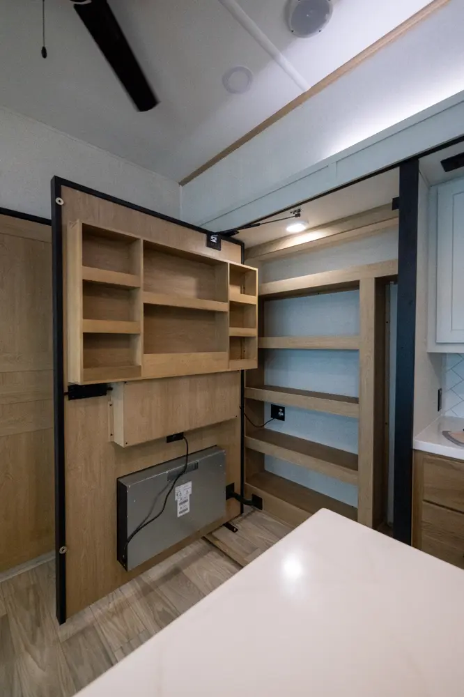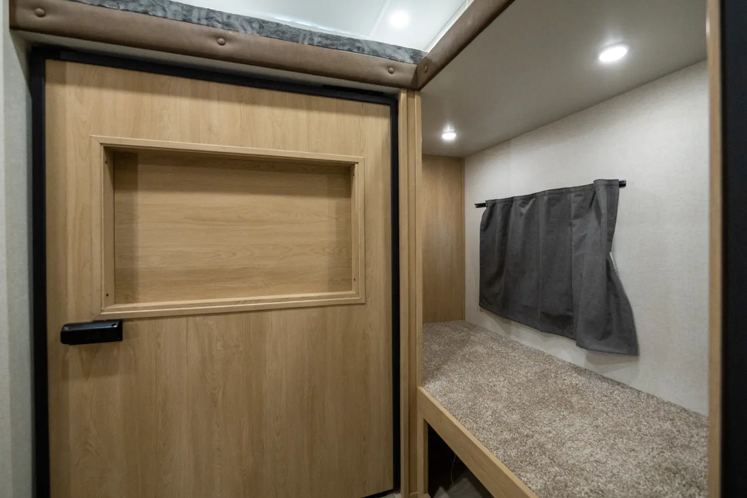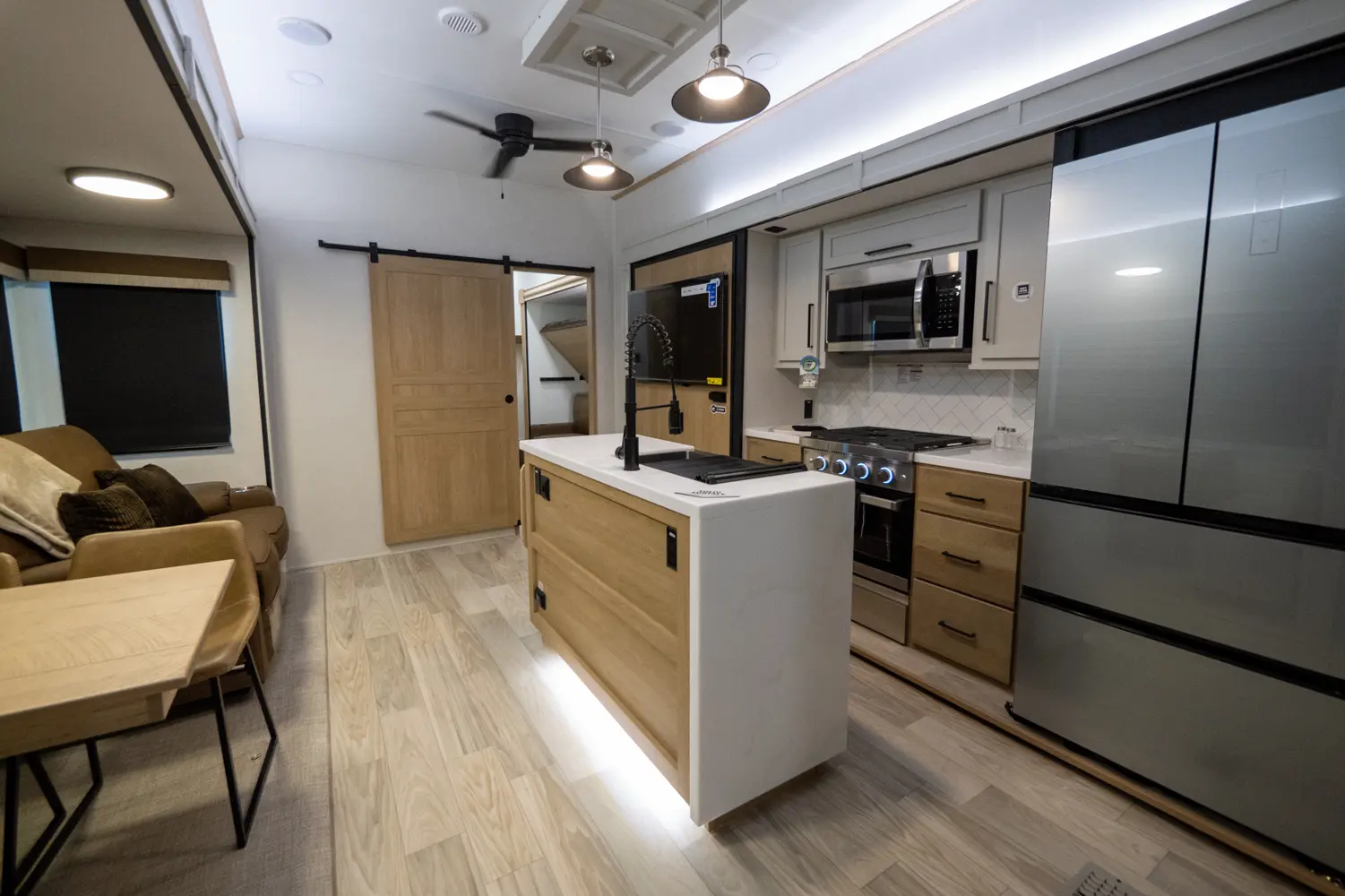 The Sandpiper Fifth Wheels 3880BH floorplan has two entries and four slide outs. Exterior features include: fiberglass exterior, 10'8" & 16' awning and outside kitchen. Interiors features include: bunk beds, kitchen island, free-standing dinette option, front bedroom and bathroom and a half.