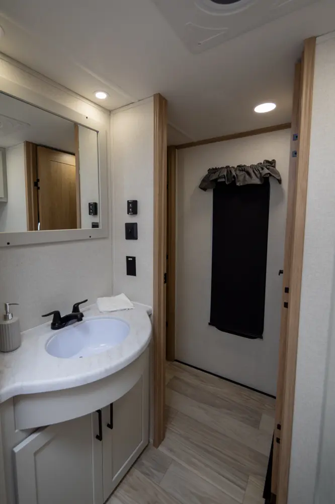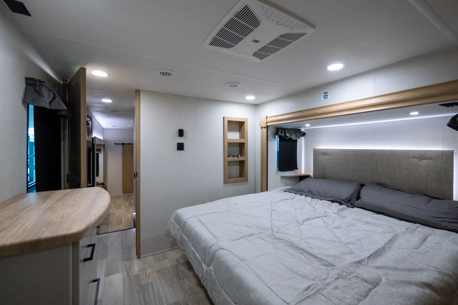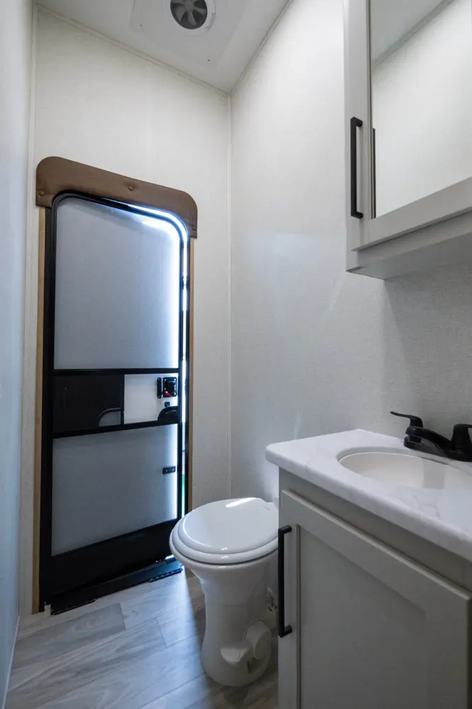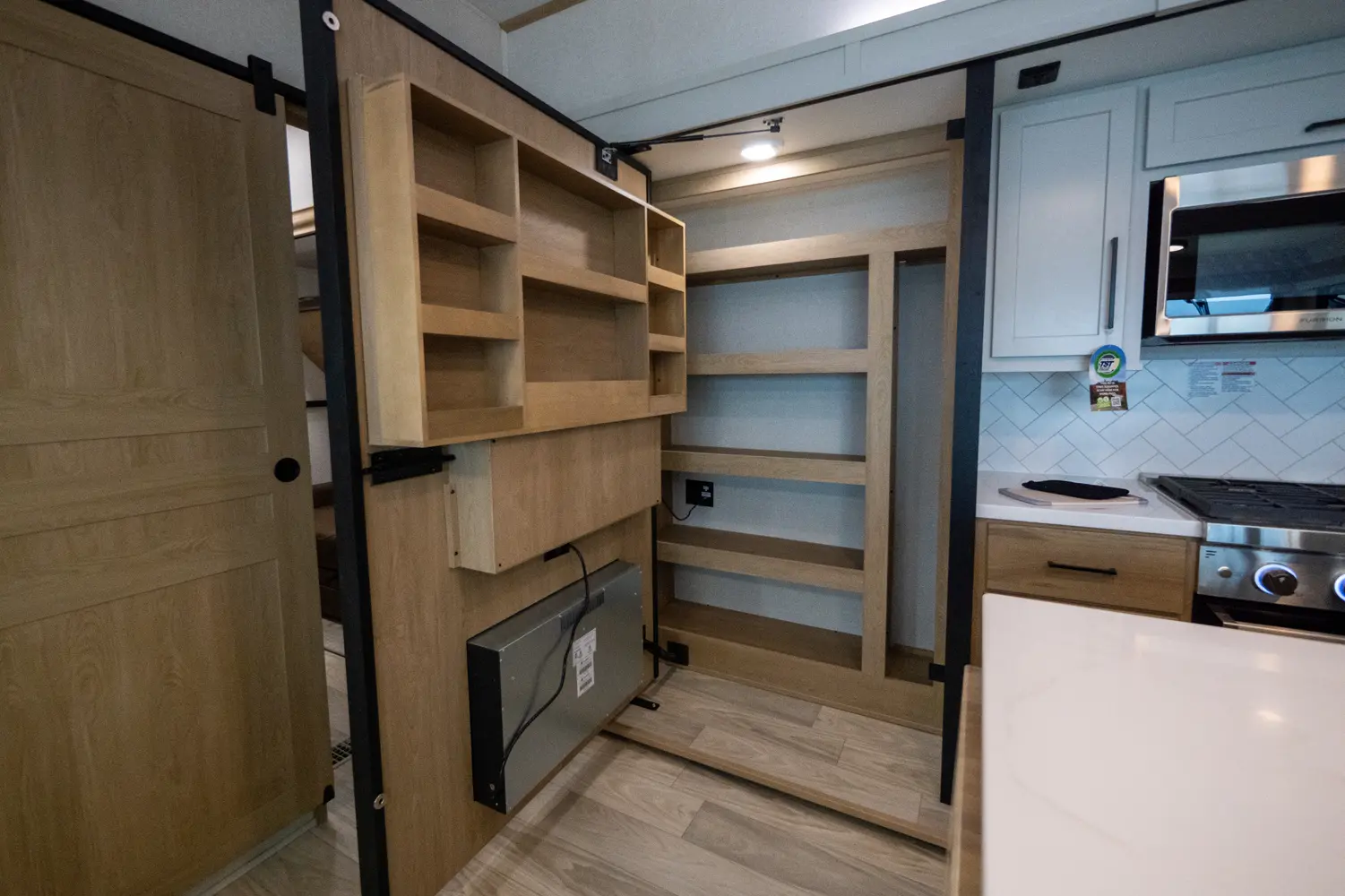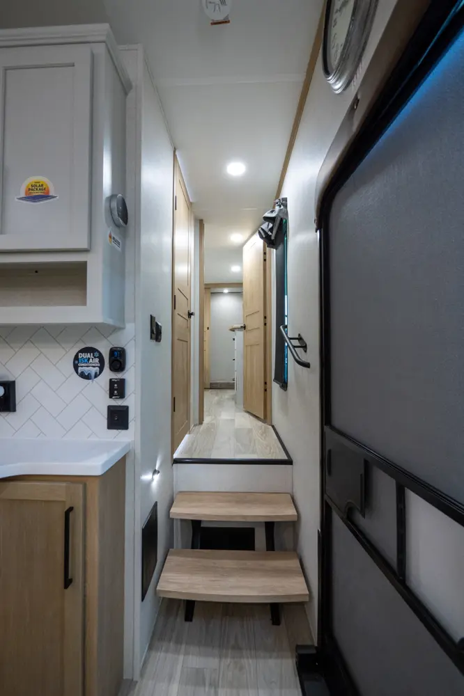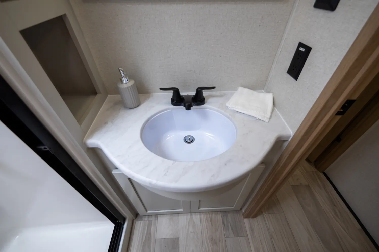 The Sandpiper Fifth Wheels 3880BH floorplan has two entries and four slide outs. Exterior features include: fiberglass exterior, 10'8" & 16' awning and outside kitchen. Interiors features include: bunk beds, kitchen island, free-standing dinette option, front bedroom and bathroom and a half.