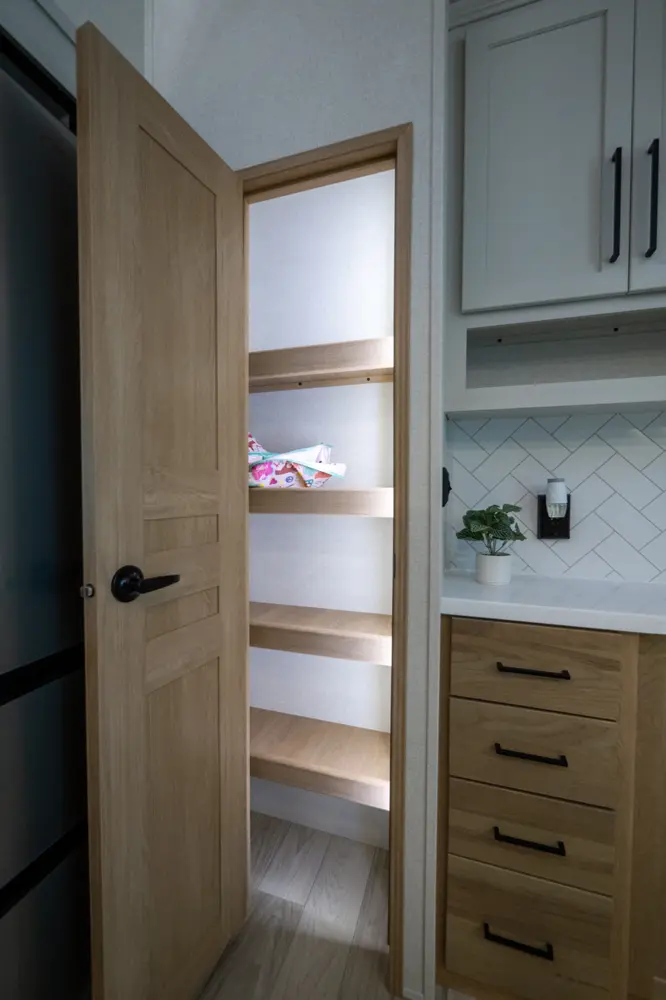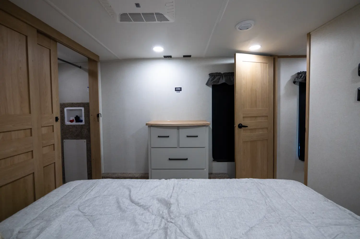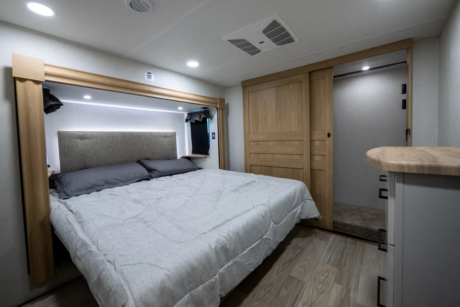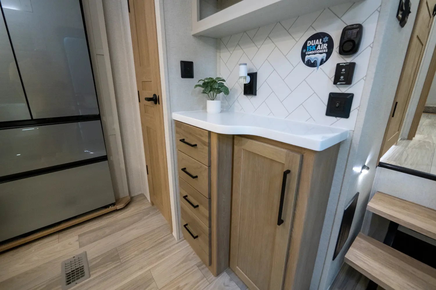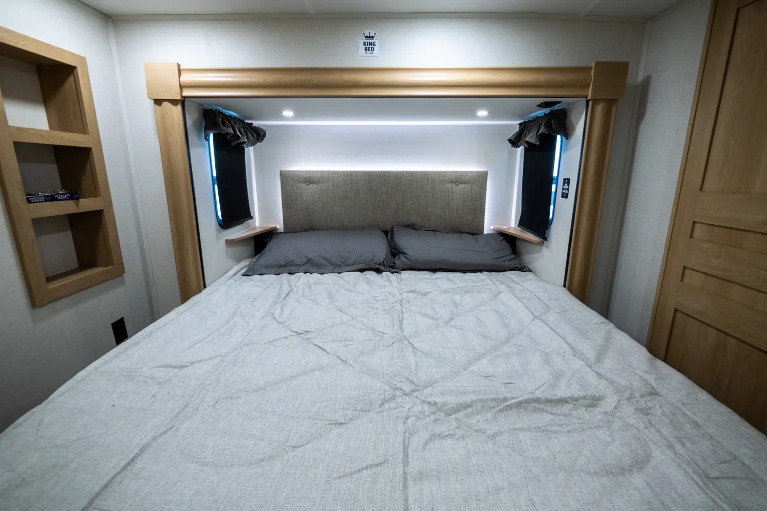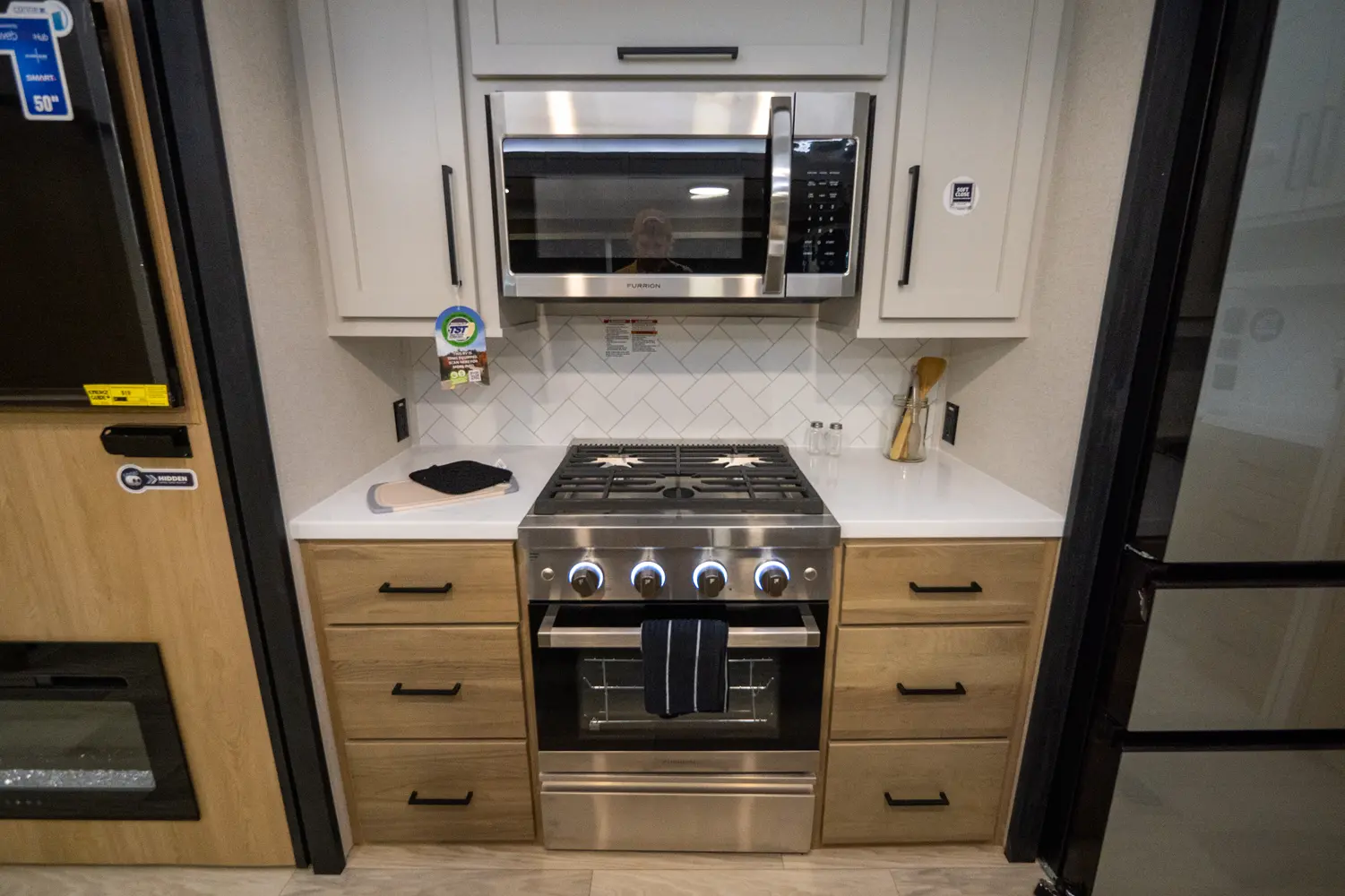 The Sandpiper Fifth Wheels 3880BH floorplan has two entries and four slide outs. Exterior features include: fiberglass exterior, 10'8" & 16' awning and outside kitchen. Interiors features include: bunk beds, kitchen island, free-standing dinette option, front bedroom and bathroom and a half.