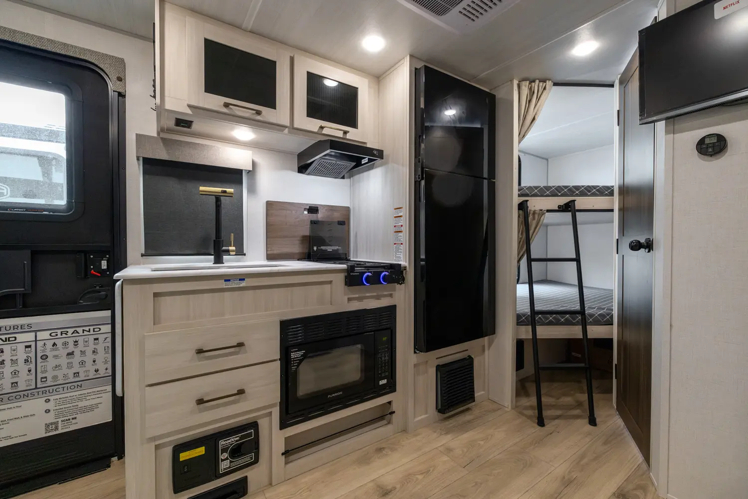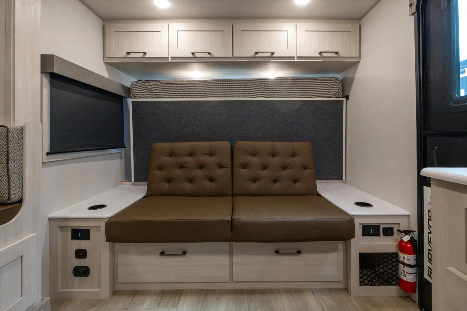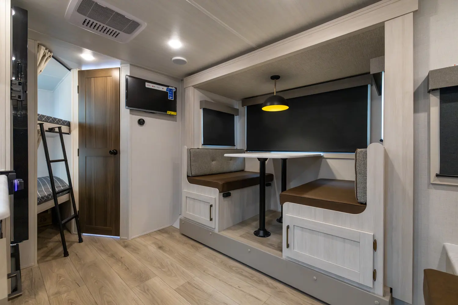 The 19MDBLE has a folding murphy-type bed on the front wall with a sofa underneath, plus end tables and overhead storage. Looking toward the rear, you have a slide room on the right wall with a 75" x 42" booth dinette, EZ-Access dinette storage, and panoramic window. The kitchen is located on the left wall and contains a sink, cooktop, convection microwave, and refrigerator, with overhead cabinets.