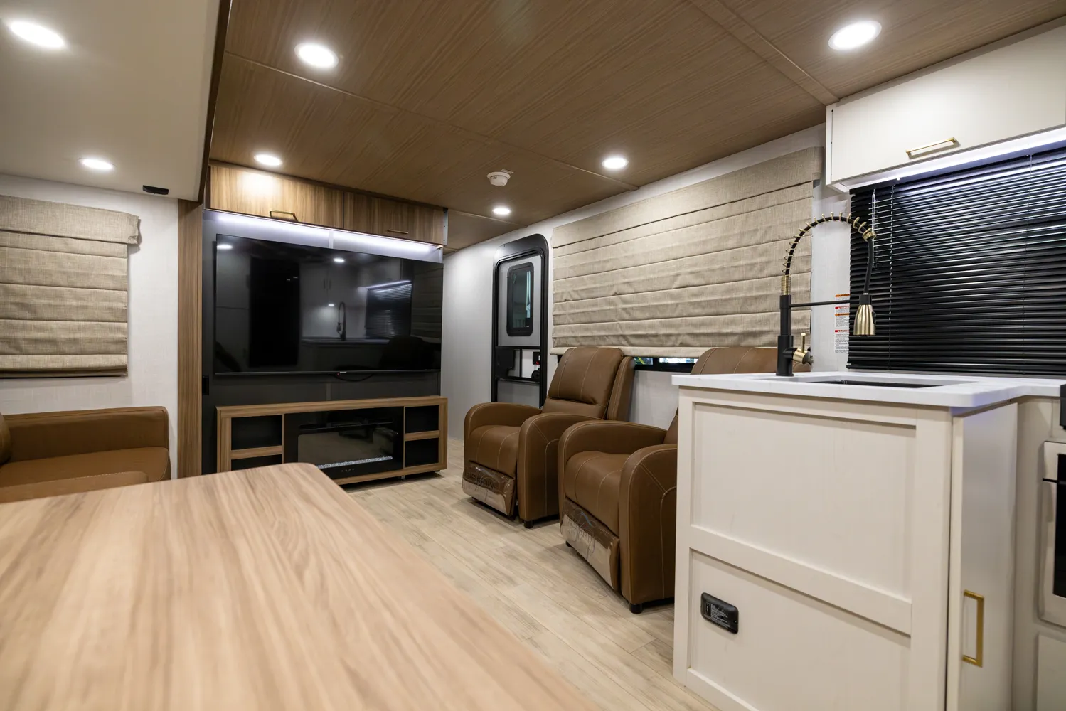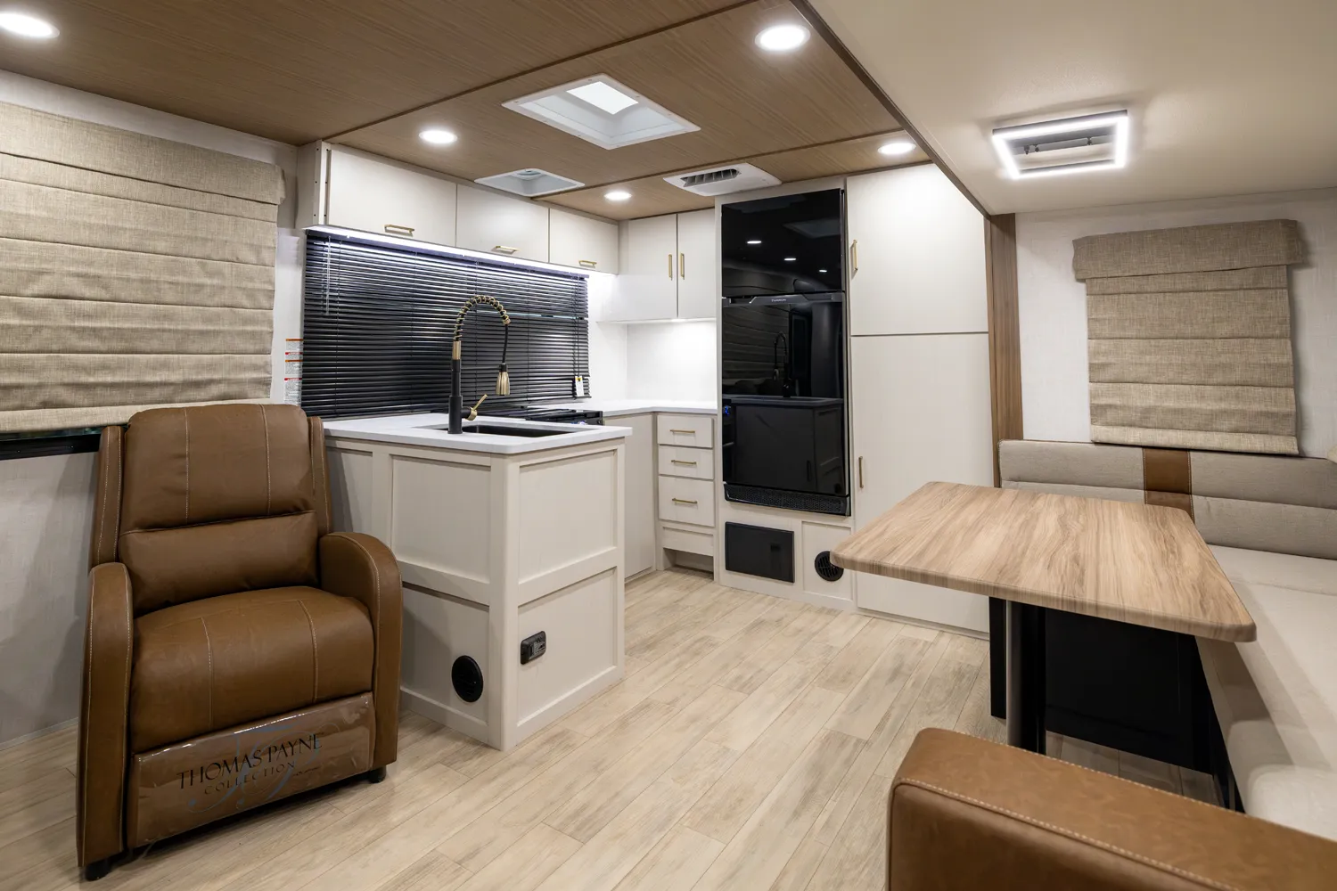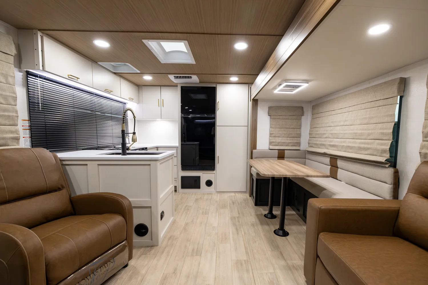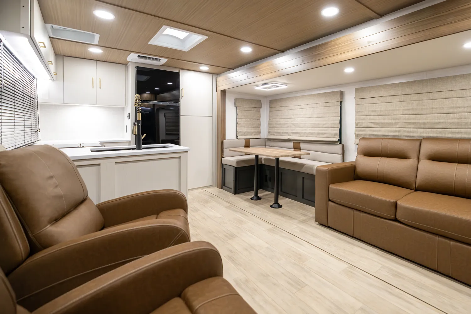 The 2600RK is a popular floorplan as we deliver a spacious rear kitchen with an ample amount of natural light and windows. This floorplan has a lot of energy focused on quality time with the family as the 2600RK comes complete with a 5-person dinette, tri-fold sofa (turns into bed), and two separate recliner chairs all within view of the kitchen. With a king bed and washer/dryer prep this lightweight coach offers more functional space than ever.