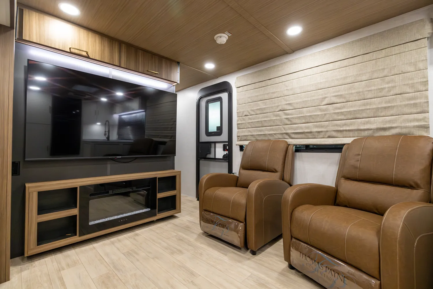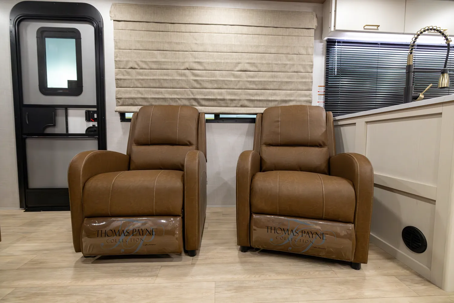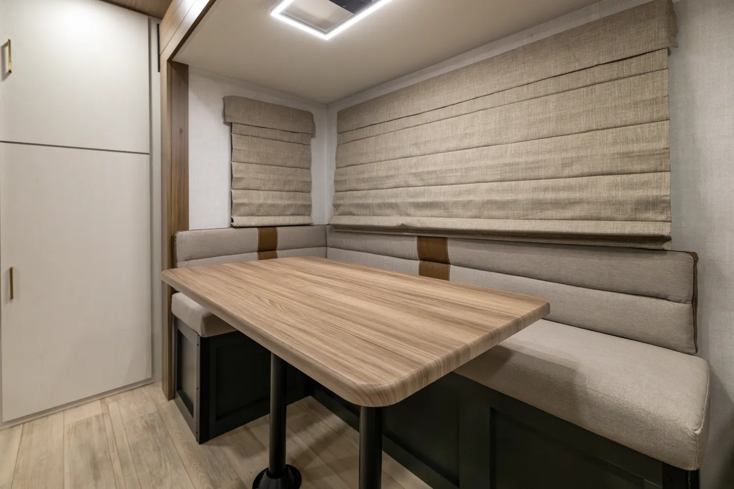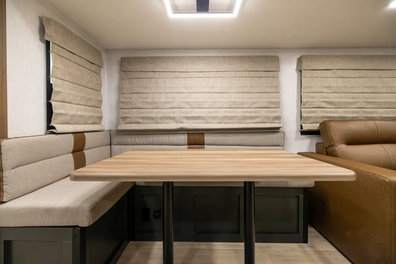 The 2600RK is a popular floorplan as we deliver a spacious rear kitchen with an ample amount of natural light and windows. This floorplan has a lot of energy focused on quality time with the family as the 2600RK comes complete with a 5-person dinette, tri-fold sofa (turns into bed), and two separate recliner chairs all within view of the kitchen. With a king bed and washer/dryer prep this lightweight coach offers more functional space than ever.