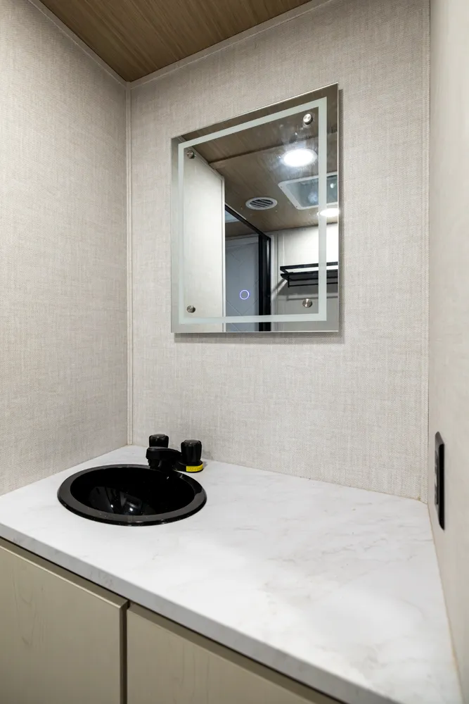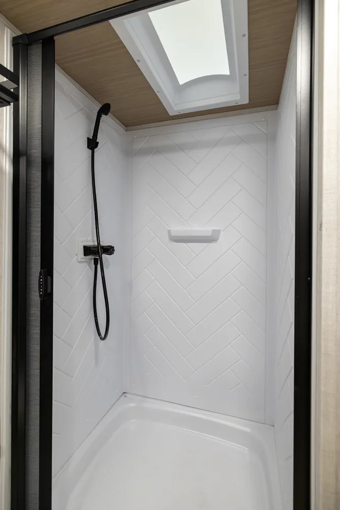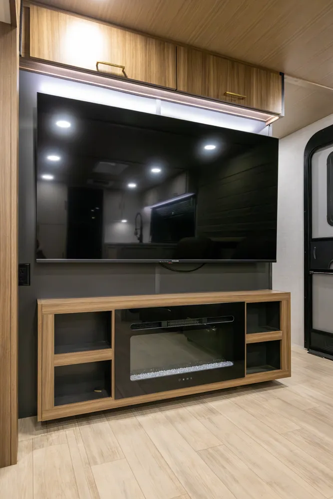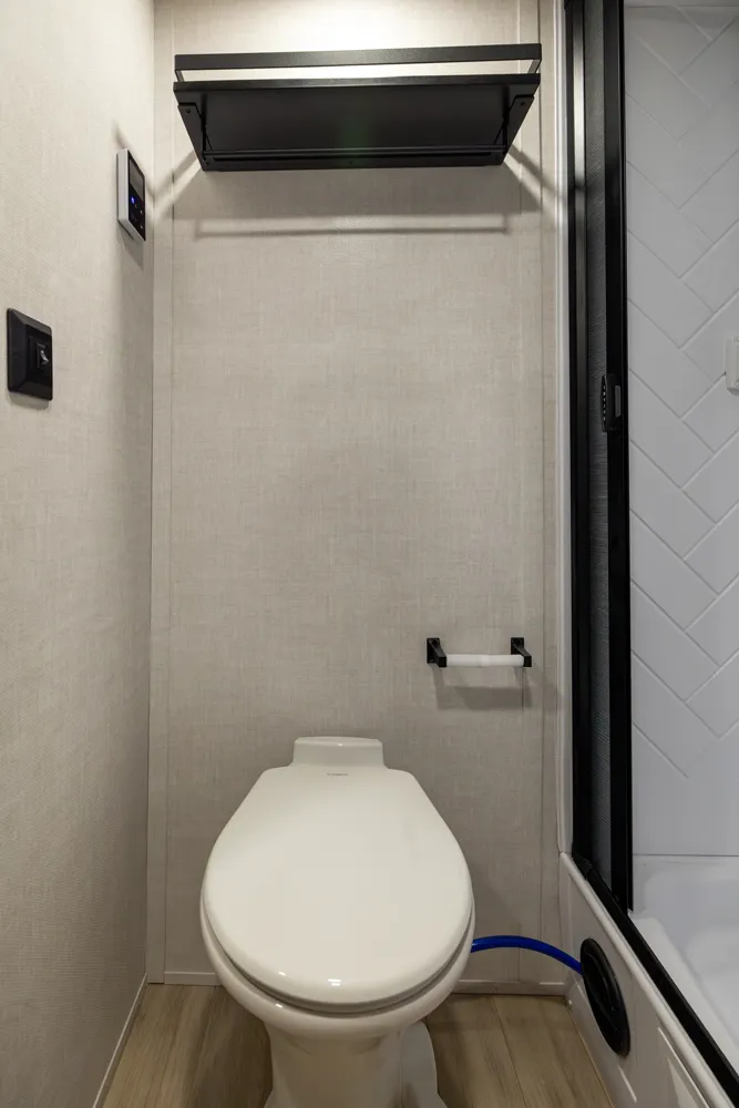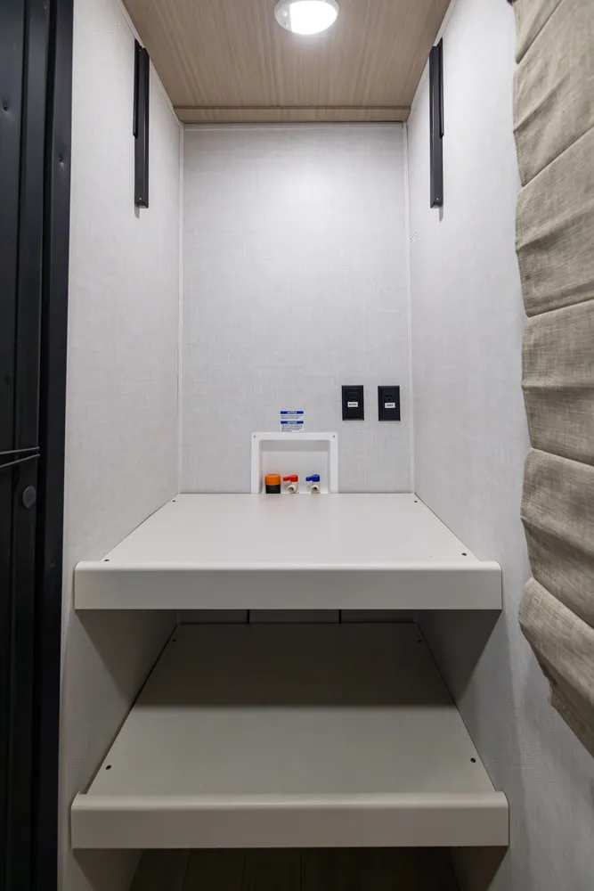 • Universal Docking Station Enclosed in Cargo Storage - Hookups Included: Cable & Satellite Switch, Fresh-Tank Gravity Fill, City Water, Black Tank Flush, Winterization Pump, Outdoor Shower, GFI Outlet, And Space Prepped for Solar Panel Controller