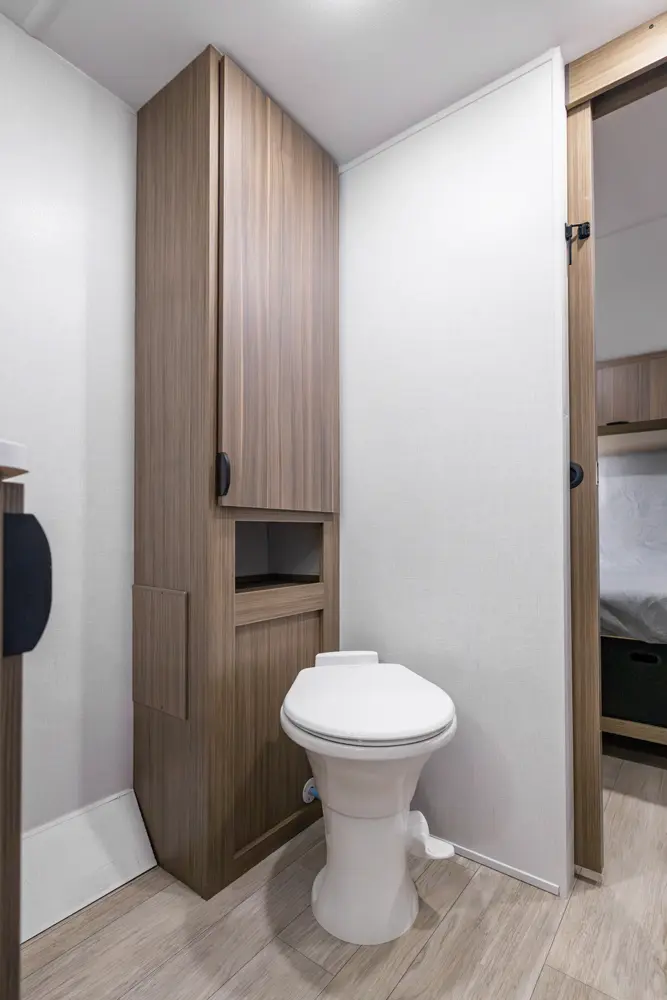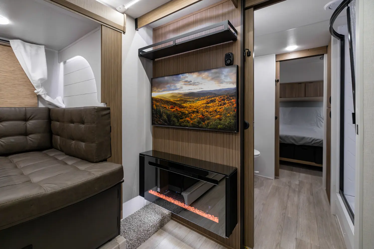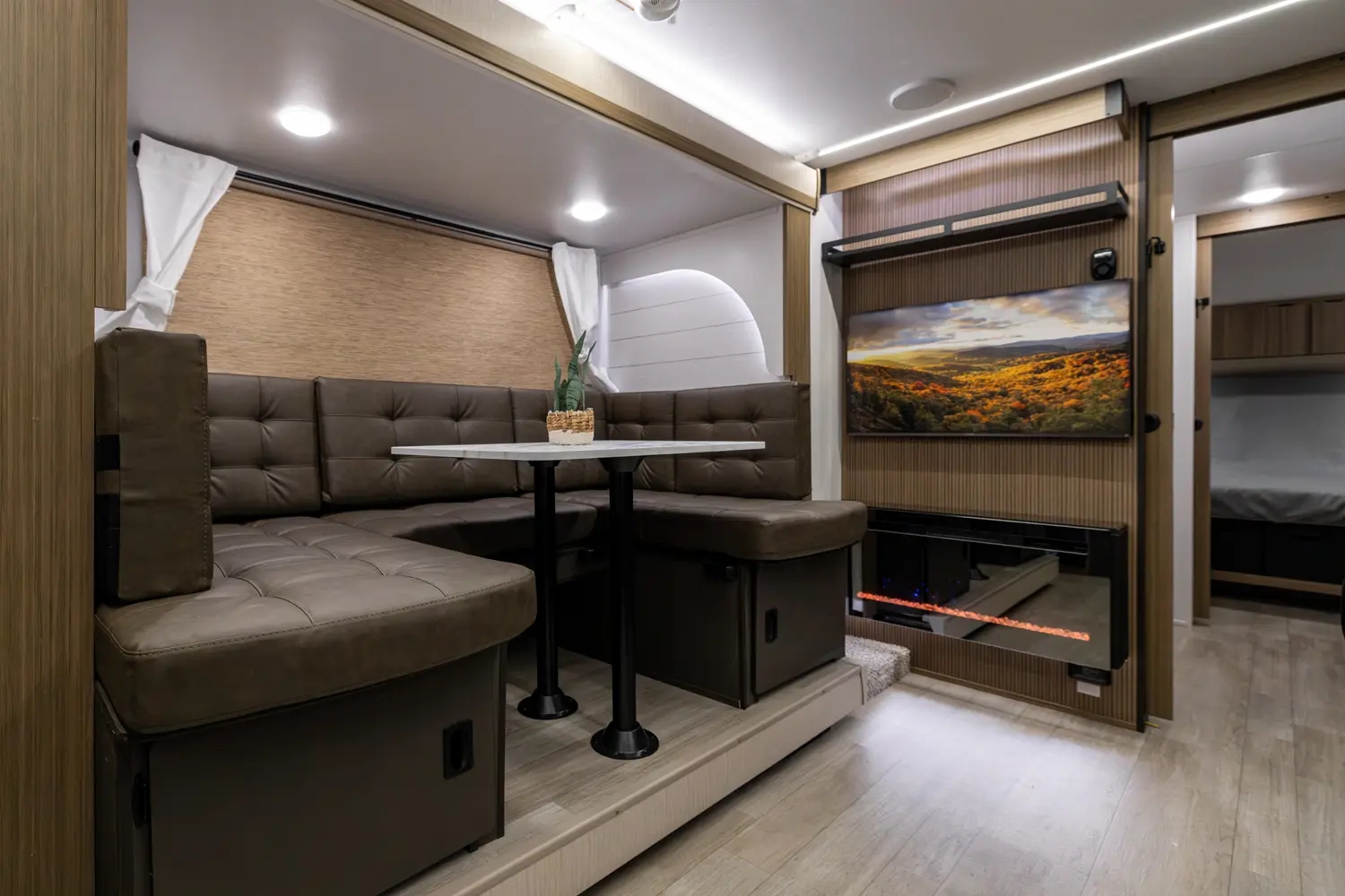 The 24RLXL is an extra-light travel trailer that comes in at 28' 11" and just over 5,000 lbs. The master bedroom features a ton of storage, including dedicated C-pap cubbies! The bathroom provides loads of storage as well, plus a walk-in shower. The kitchen is well-appointed with modern appliances and an oversized 11 CU. FT. refrigerator, fireplace, and U-dinette.