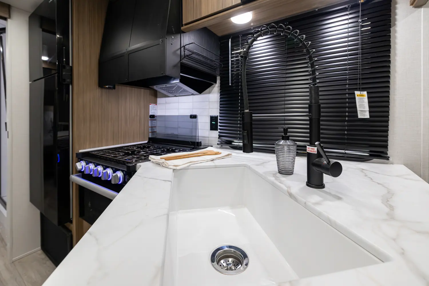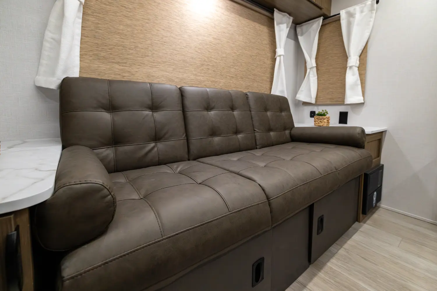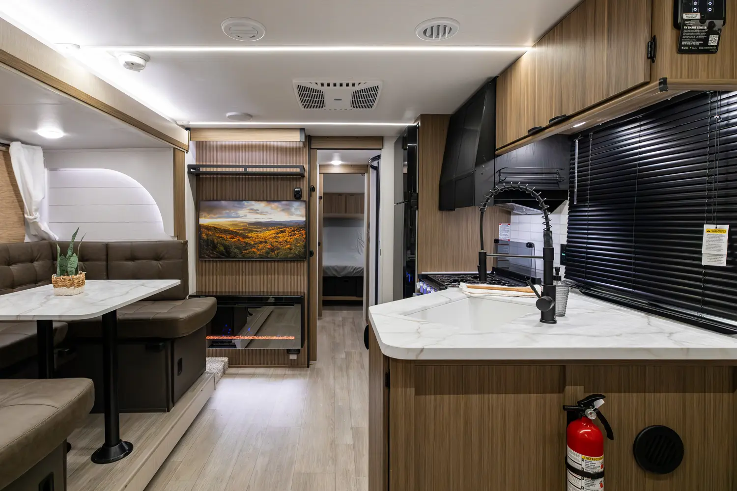 The 24RLXL is an extra-light travel trailer that comes in at 28' 11" and just over 5,000 lbs. The master bedroom features a ton of storage, including dedicated C-pap cubbies! The bathroom provides loads of storage as well, plus a walk-in shower. The kitchen is well-appointed with modern appliances and an oversized 11 CU. FT. refrigerator, fireplace, and U-dinette.