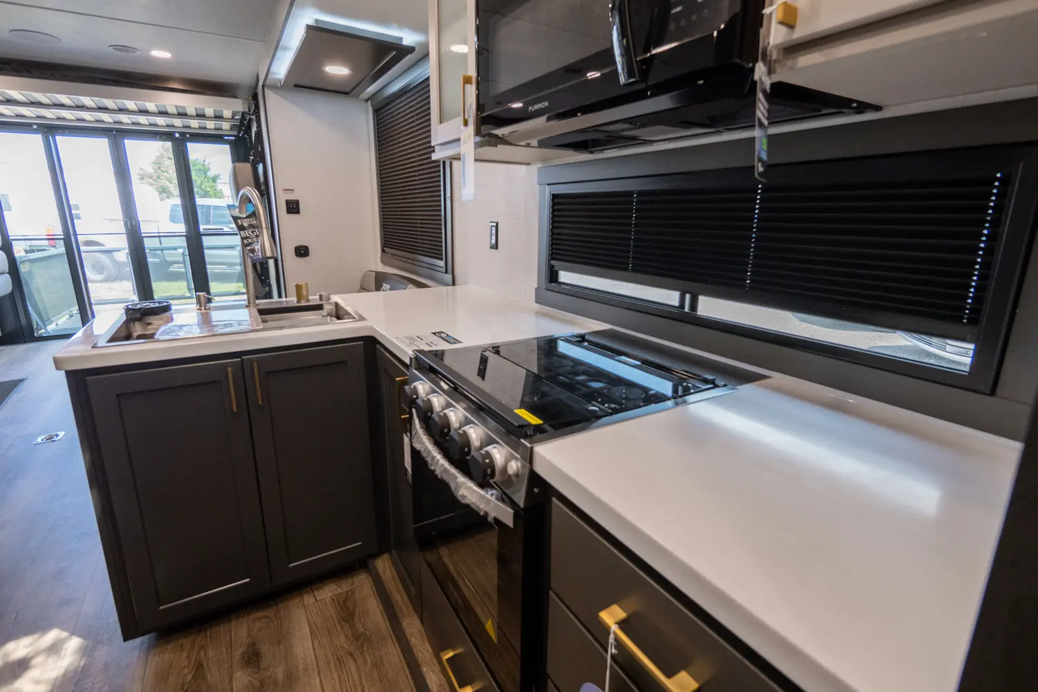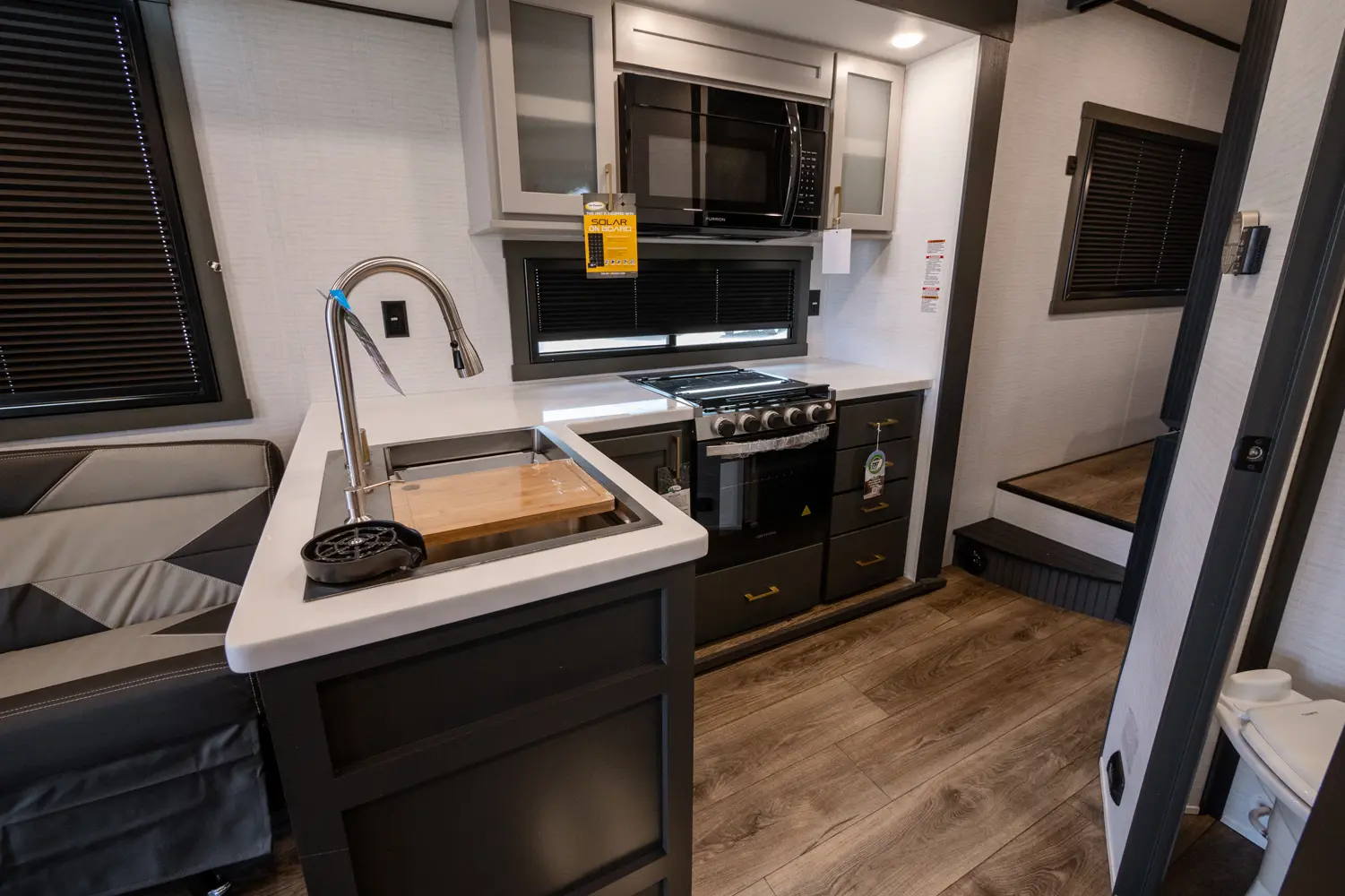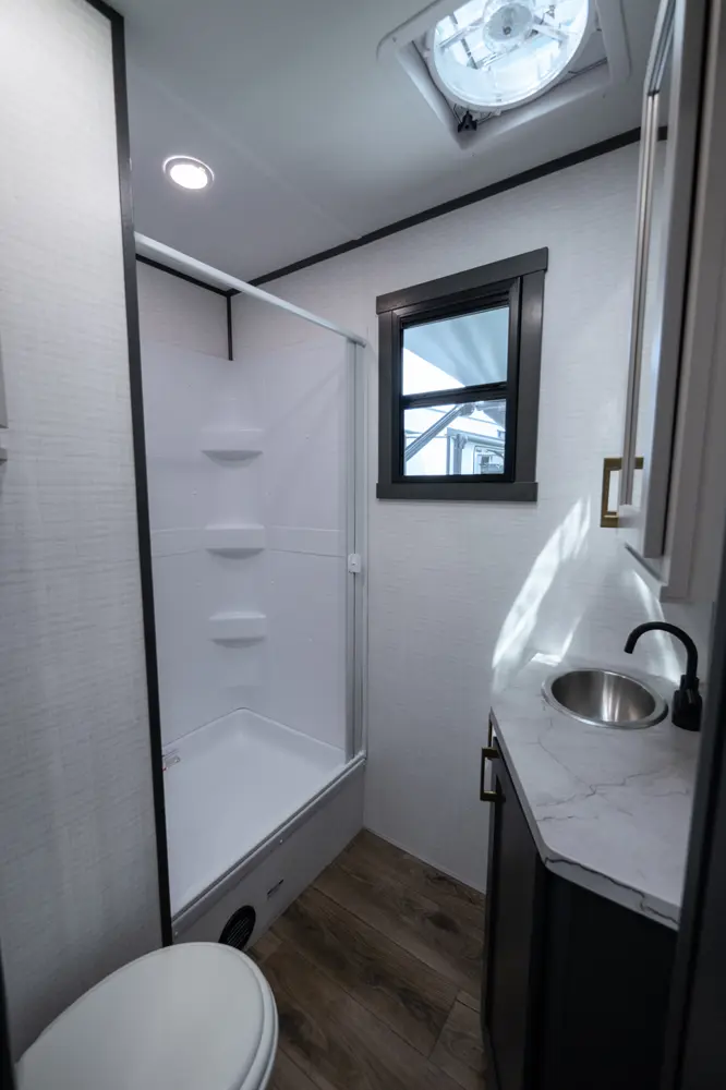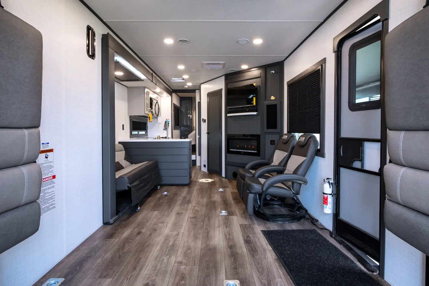 LED lightning, ducted A/C & heat, Dexter axles, solid wood & raised panel cabinetry, roof with 3/8" decking, standard fully enclosed underbelly, night shades, 5,000 lb cargo tie downs, two-tone grey exterior, optional party deck, and friction hinge doors are just some of the offerings on a Hyper Lite Toy Hauler.