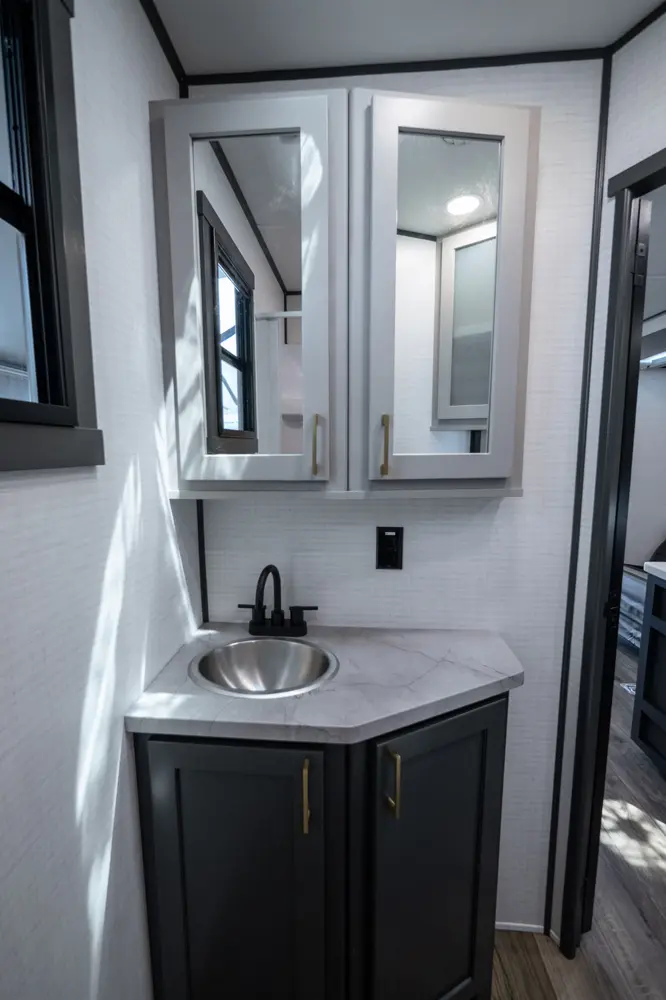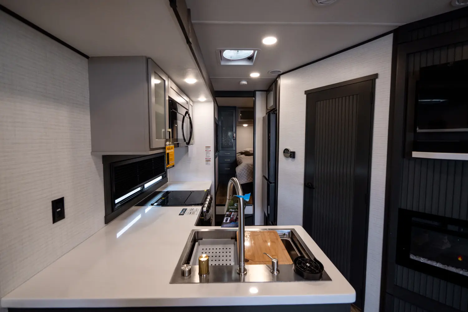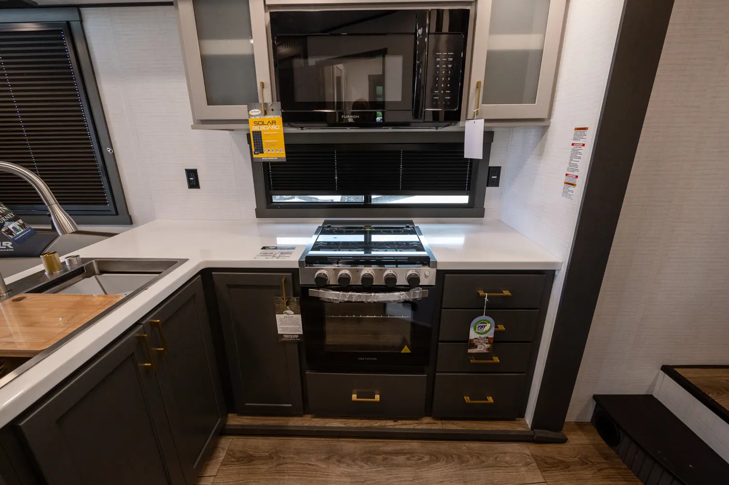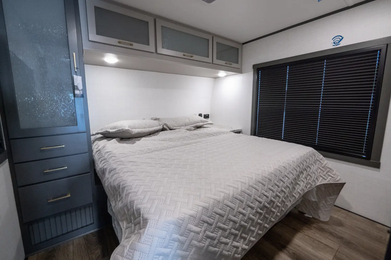 LED lightning, ducted A/C & heat, Dexter axles, solid wood & raised panel cabinetry, roof with 3/8" decking, standard fully enclosed underbelly, night shades, 5,000 lb cargo tie downs, two-tone grey exterior, optional party deck, and friction hinge doors are just some of the offerings on a Hyper Lite Toy Hauler.